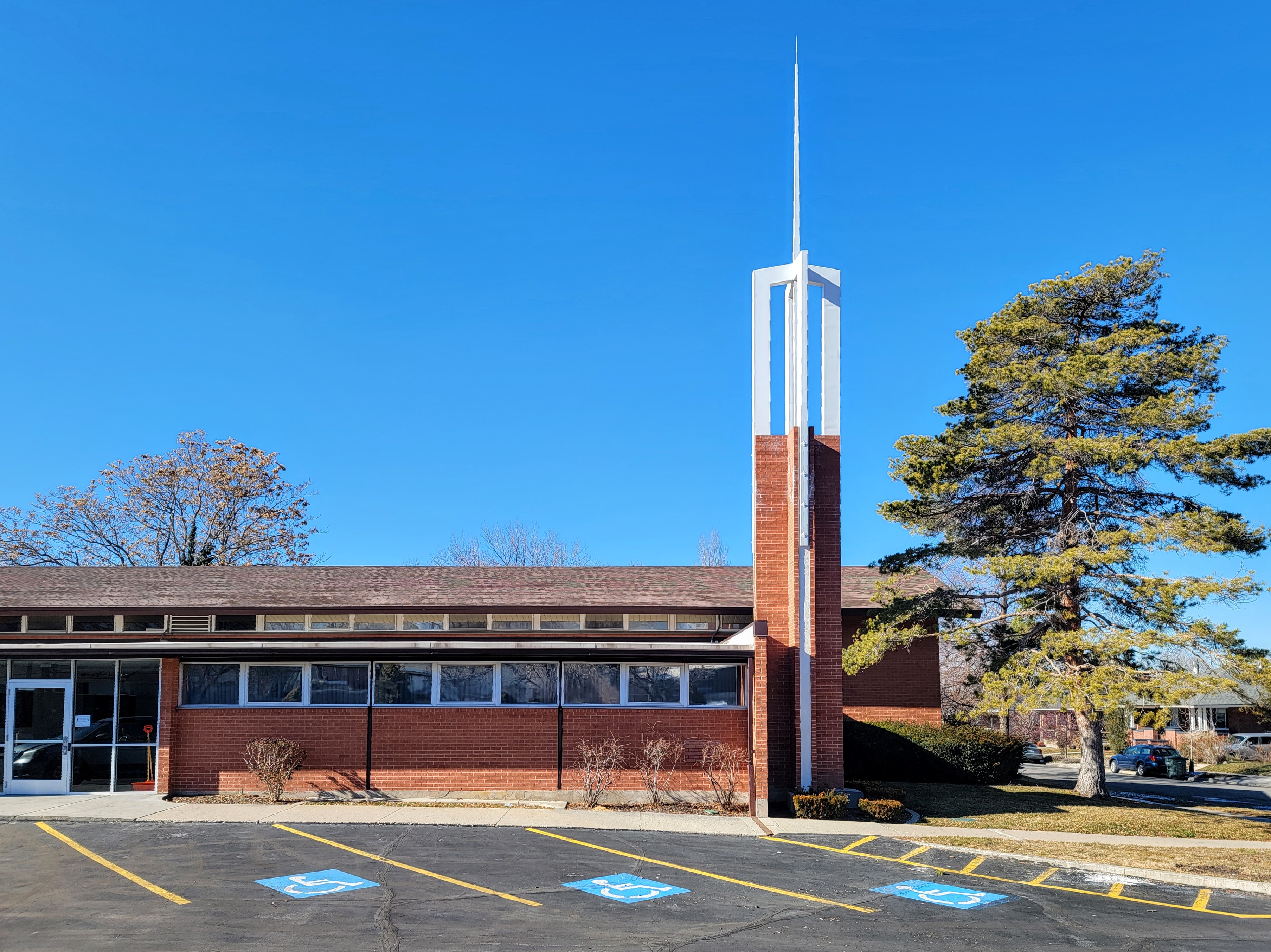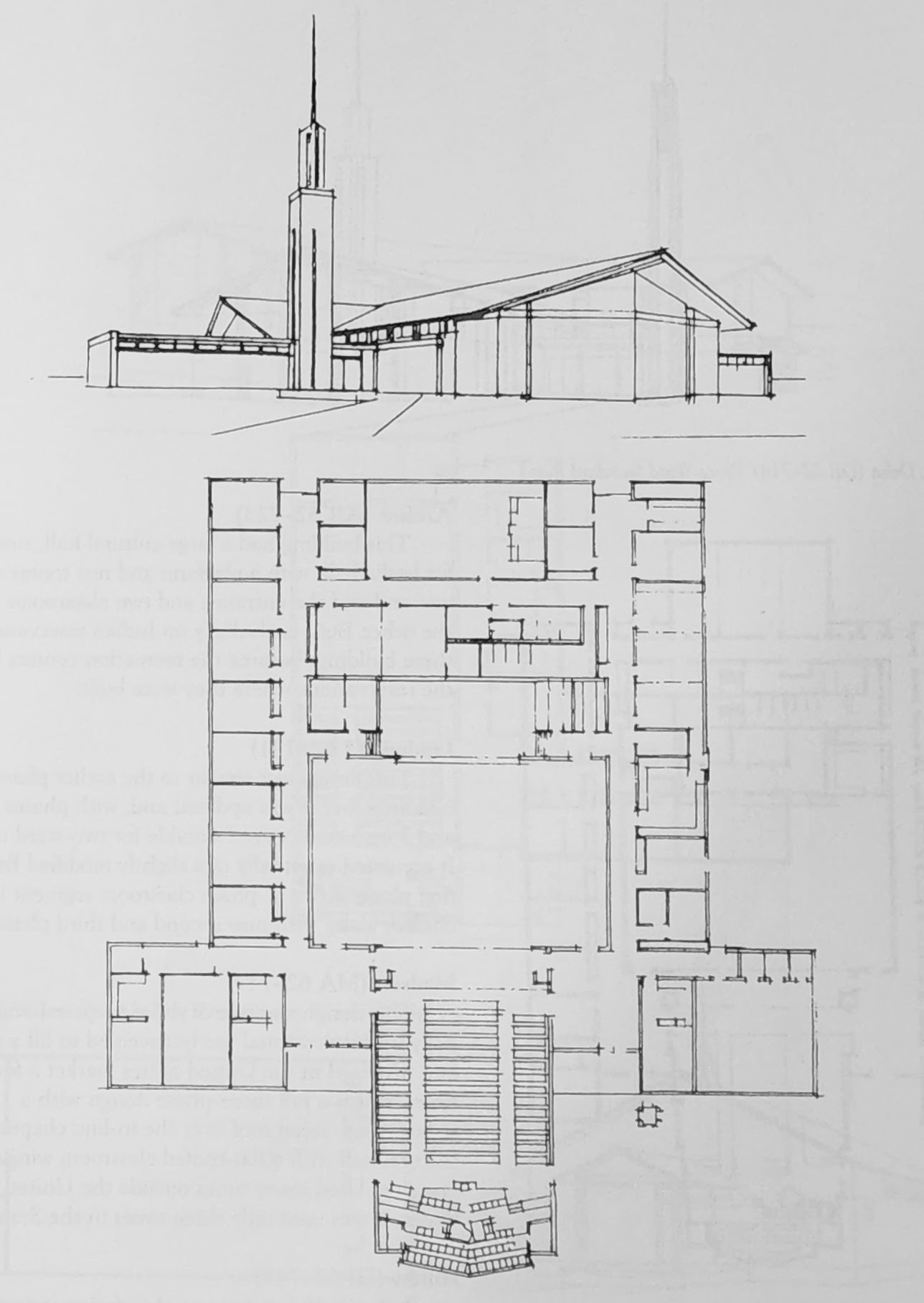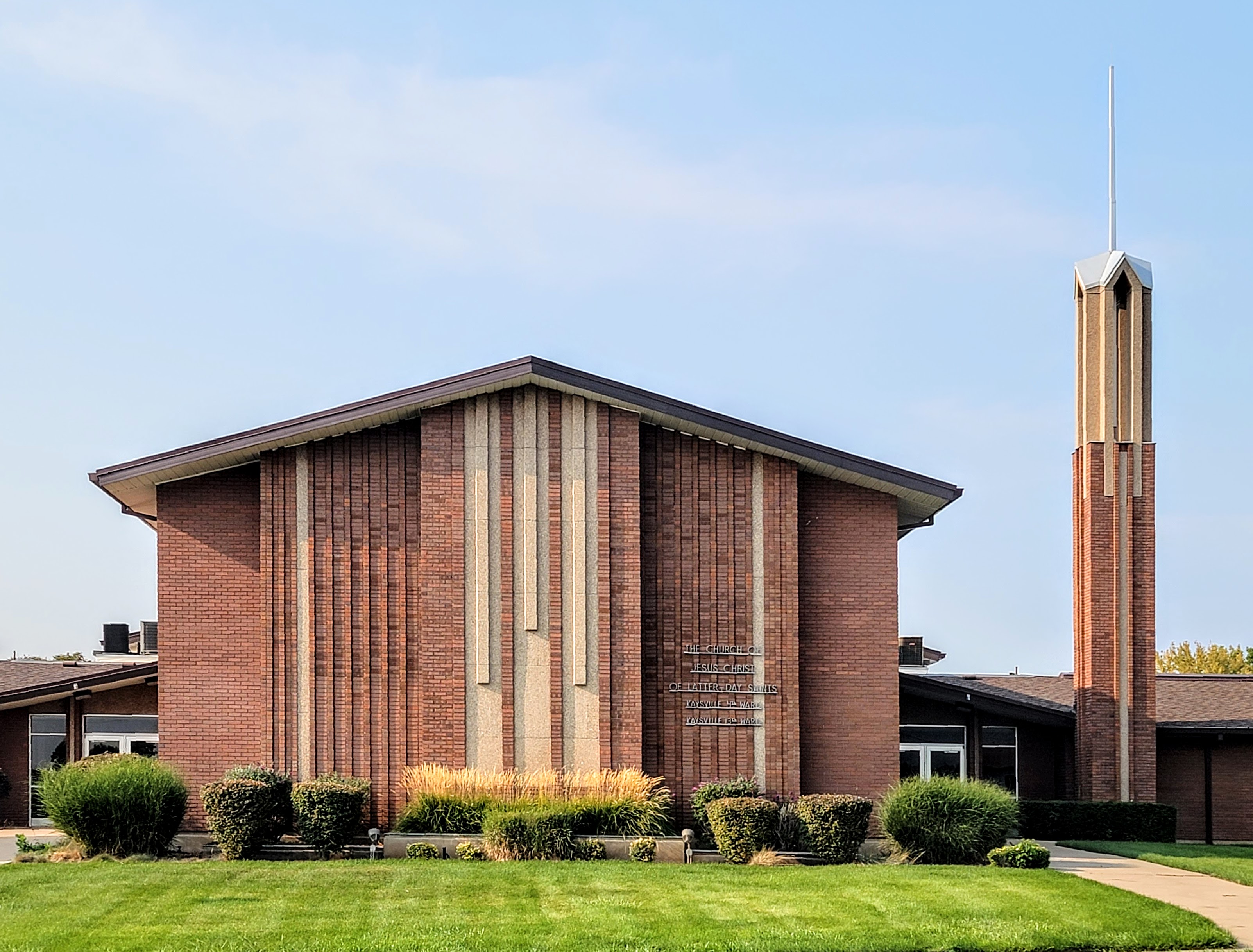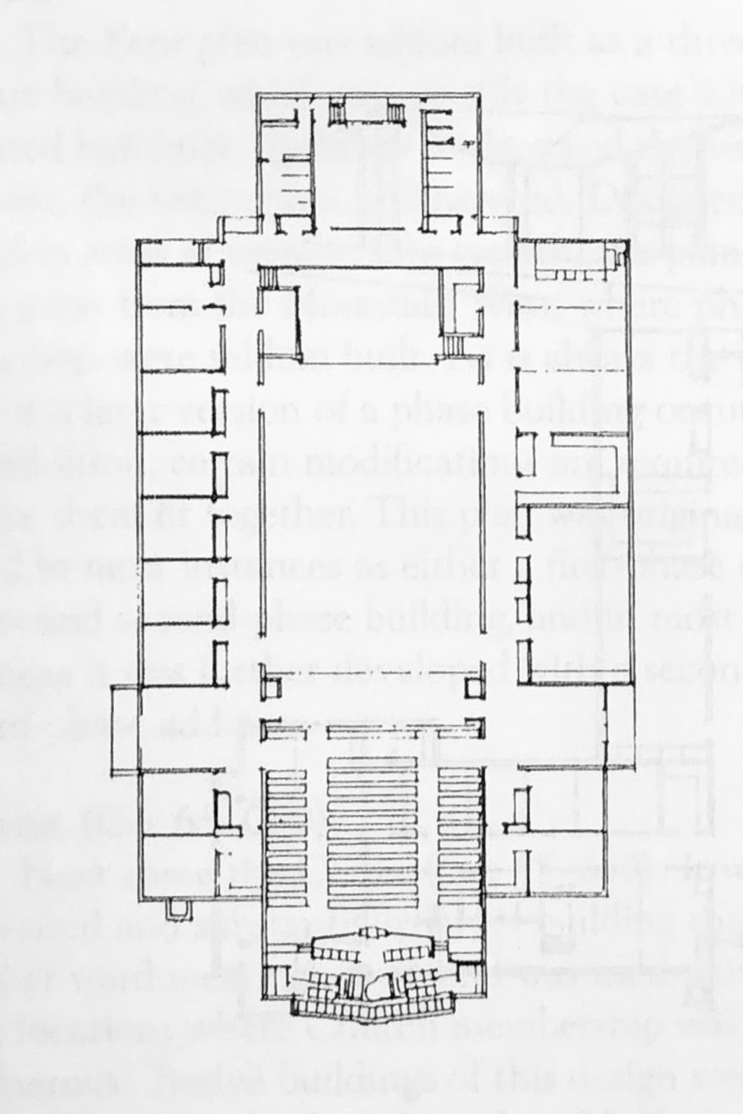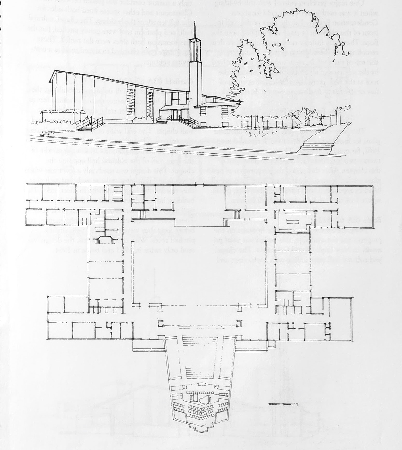 The Dalton (and its predecessor, the Freeman) was a popular mid-sized ward plan which was built 136 times. It is rectangular in shape which enabled it to be built on more narrow lots. Unlike the later rectangular models of the 80s to the present, the Dalton separated the roofs of the classrooms from roof of the central gabled chapel, thus helping the building retain its mid-century modern character.