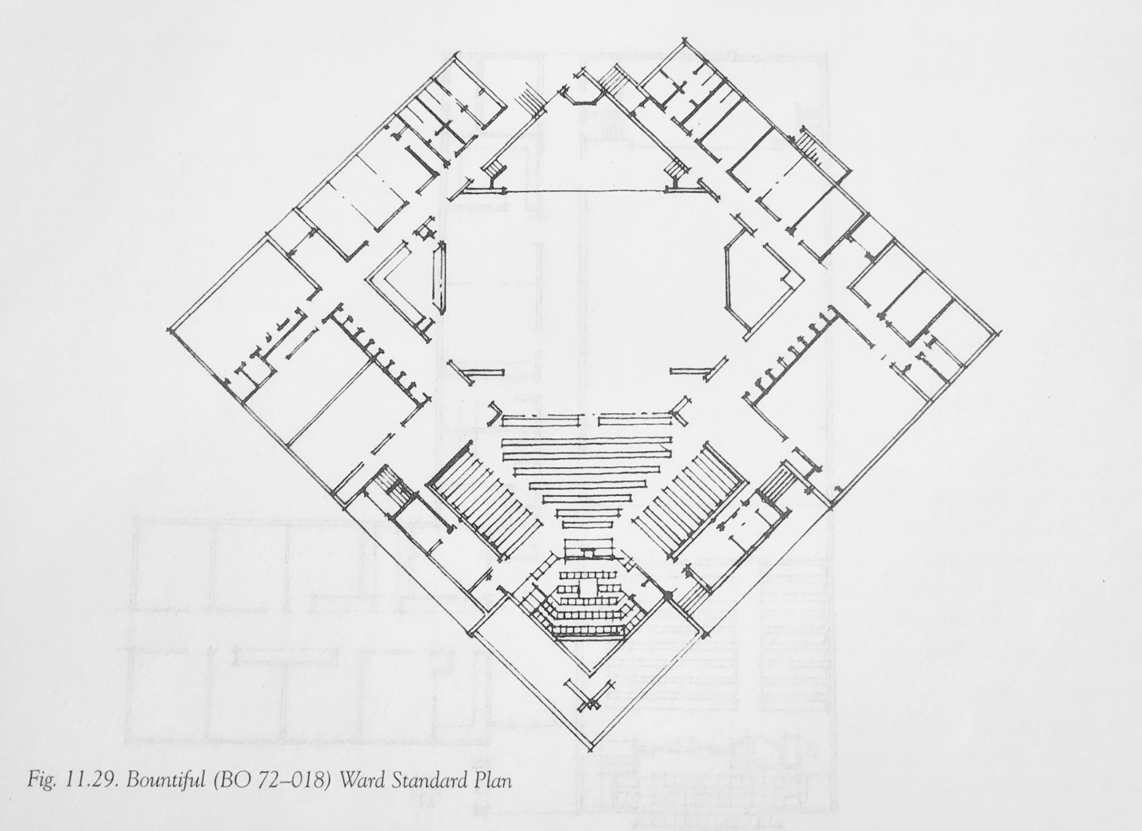 While there were hundreds of plans introduced by the church in the 60s and 70s, the vast majority of Utah meetinghouses were built on a short list of about a dozen of these standard plans. This post will take a closer look at ten of them. My guide will be Richard L. Jackson’s Places of Worship, an excellent and comprehensive account of this period in LDS architecture. Jackson was a church architect for decades and the blueprints highlighted in this post are taken from his drawings. (If you suspect that your meetinghouse might be one of these standard plans, you can easily check google maps to see if the satellite image matches one of these blueprints.)
