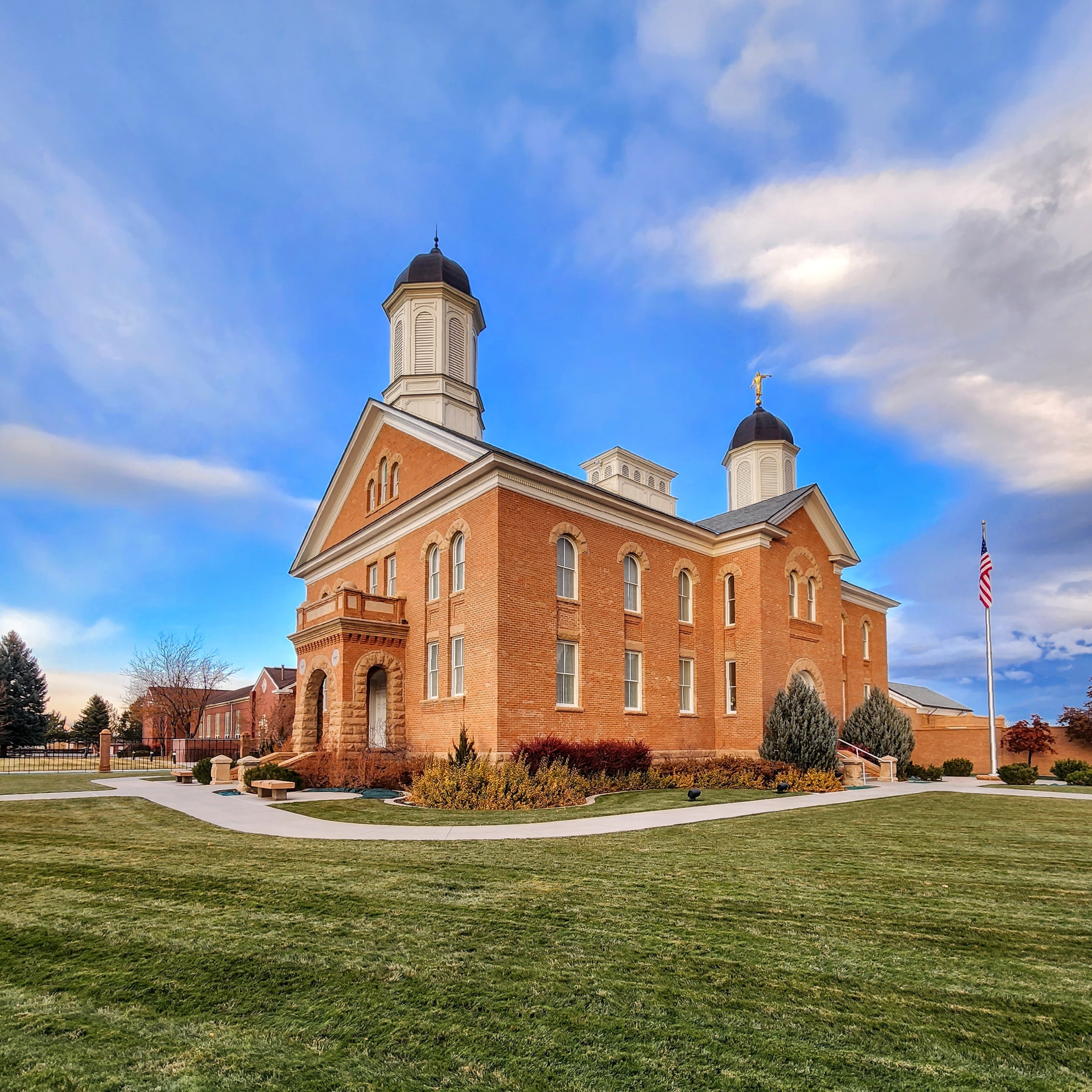 • Style: A simple colonial-style church format, with rusticated Romanesque Revival stonework around the arched windows. The local sandstone glows beautifully in the sunlight. An additional tower was added for the temple remodel, one slightly higher than the other, following a precedent set in the 19th century Utah temples: Manti, St. George, Logan and Salt Lake. The two-tower design is symbolic of the two priesthoods: Aaronic for the shorter and Melchizedek for the taller tower.