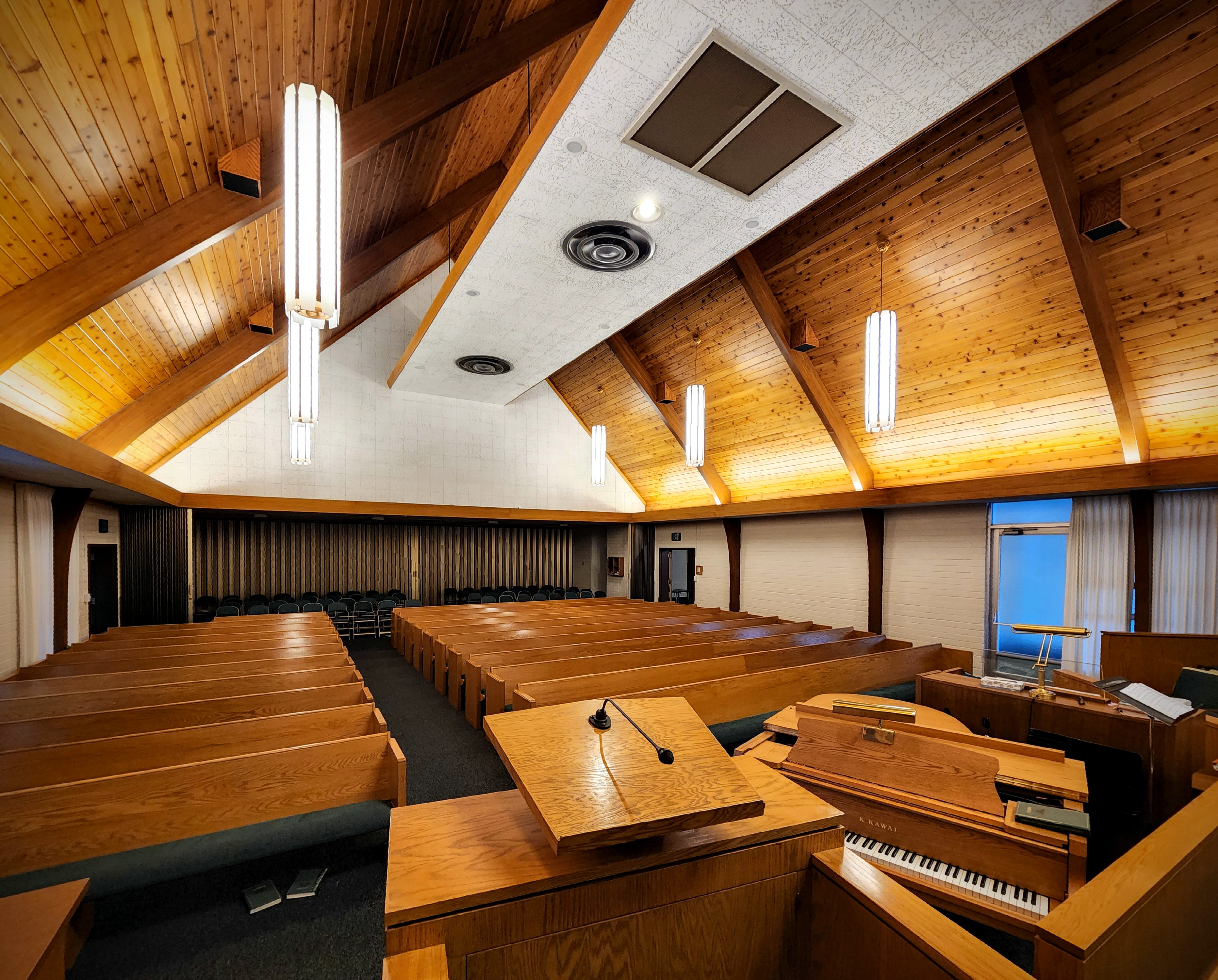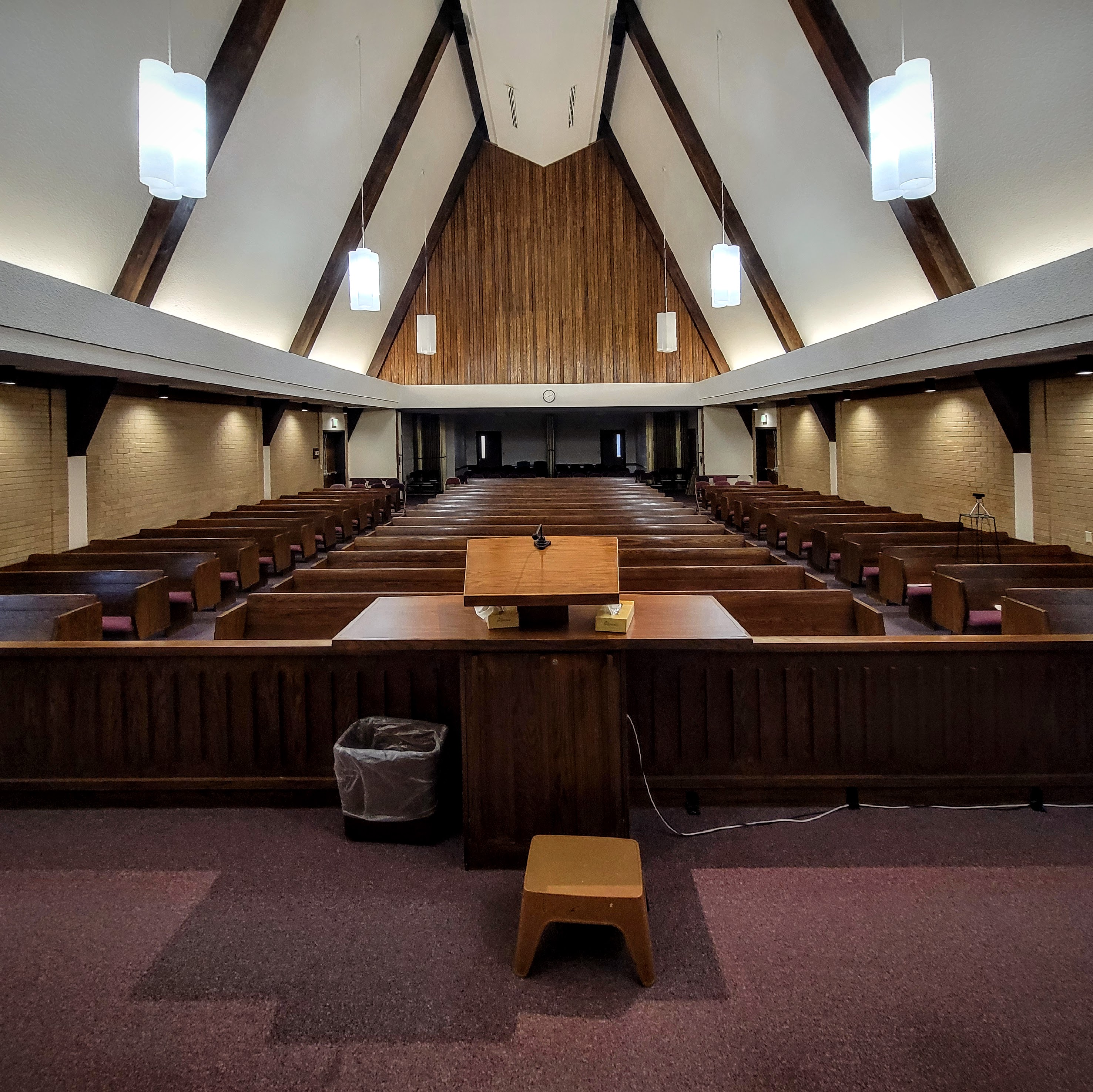 The interior of the Brower and Cody plans also departed dramatically from the other standard plans. Previous chapel interiors had an “enclosed” feel about them. They often featured organic materials like brick and darkly stained wood paneling, which gave the enclosure a warm, comforting quality. The Brower and Cody chapels have the opposite effect. They are broad, open, and filled with light. The cove lighting surrounding the chapel is set lower than in the other standard plans, which makes the ceiling feel open and expansive. Additionally, the ceiling has a sculptural quality reminiscent of abstracted clouds, enhancing its sky-like qualities. Long courses of wood paneling emphasize horizontal rather than vertical lines. The Brower and Cody standard plans would change the nature of LDS chapel design going forward. To this day, LDS chapels all have a wide, bright, and open feel to them.
