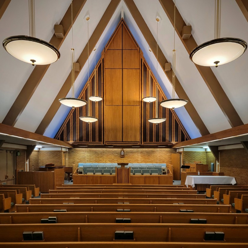 Since the 1980s, LDS meetinghouse architecture has returned to classical or colonial motifs. Occasionally gothic or craftsman motifs are added. But modernist purity has been completely abandoned. It’s been over 40 years since this classical revival and it’s worth asking if a modernist revival might be on the horizon. In 2022, the LDS church built a new meetinghouse in downtown Salt Lake City as part of the 95 State office complex. It is entirely modern and even includes a new spire in the classic 1960s style. The interior of the chapel is refreshingly minimalist, with an open, airy quality unencumbered by classical motifs. Could this modern chapel be a sign of more to come?