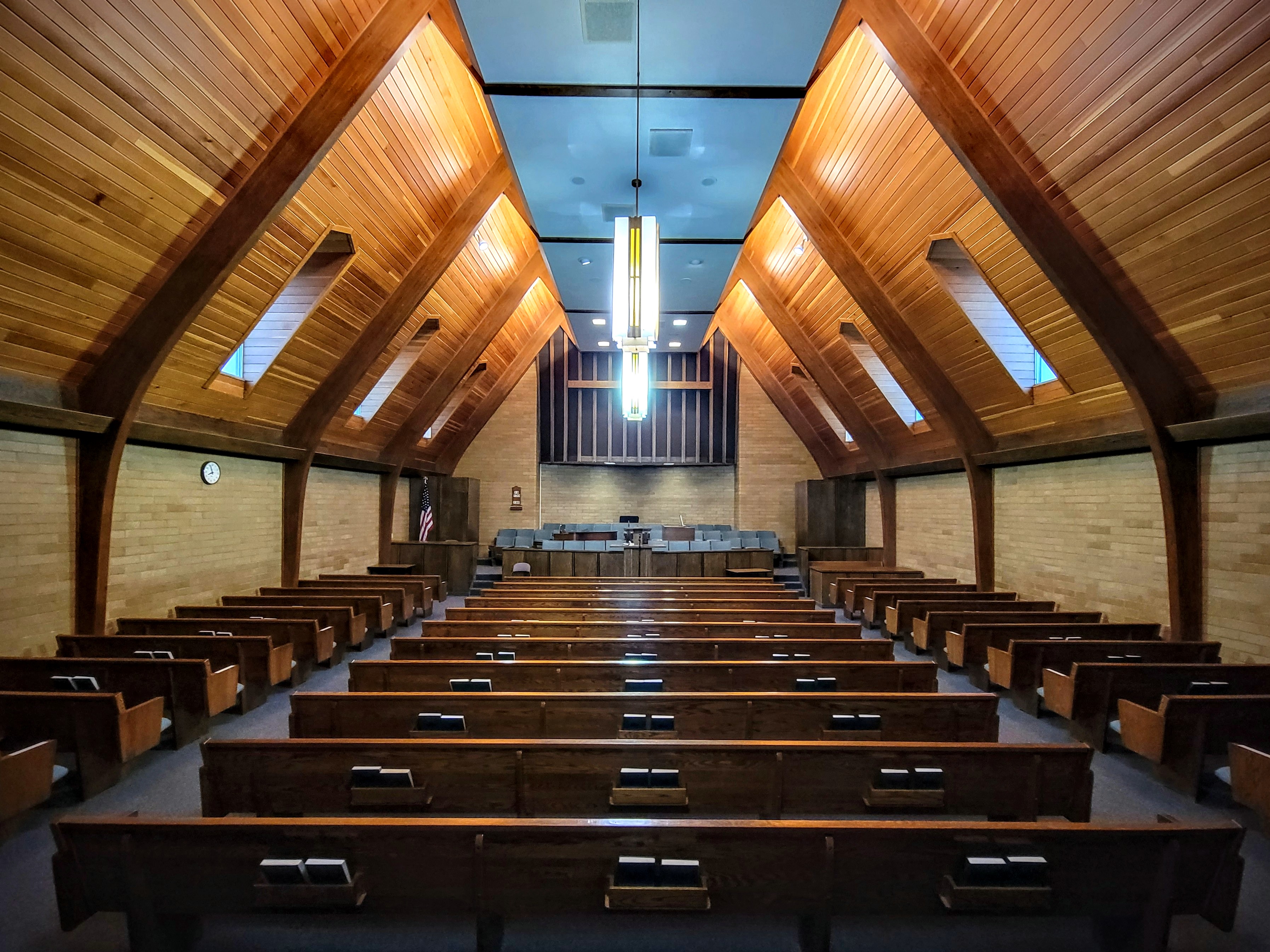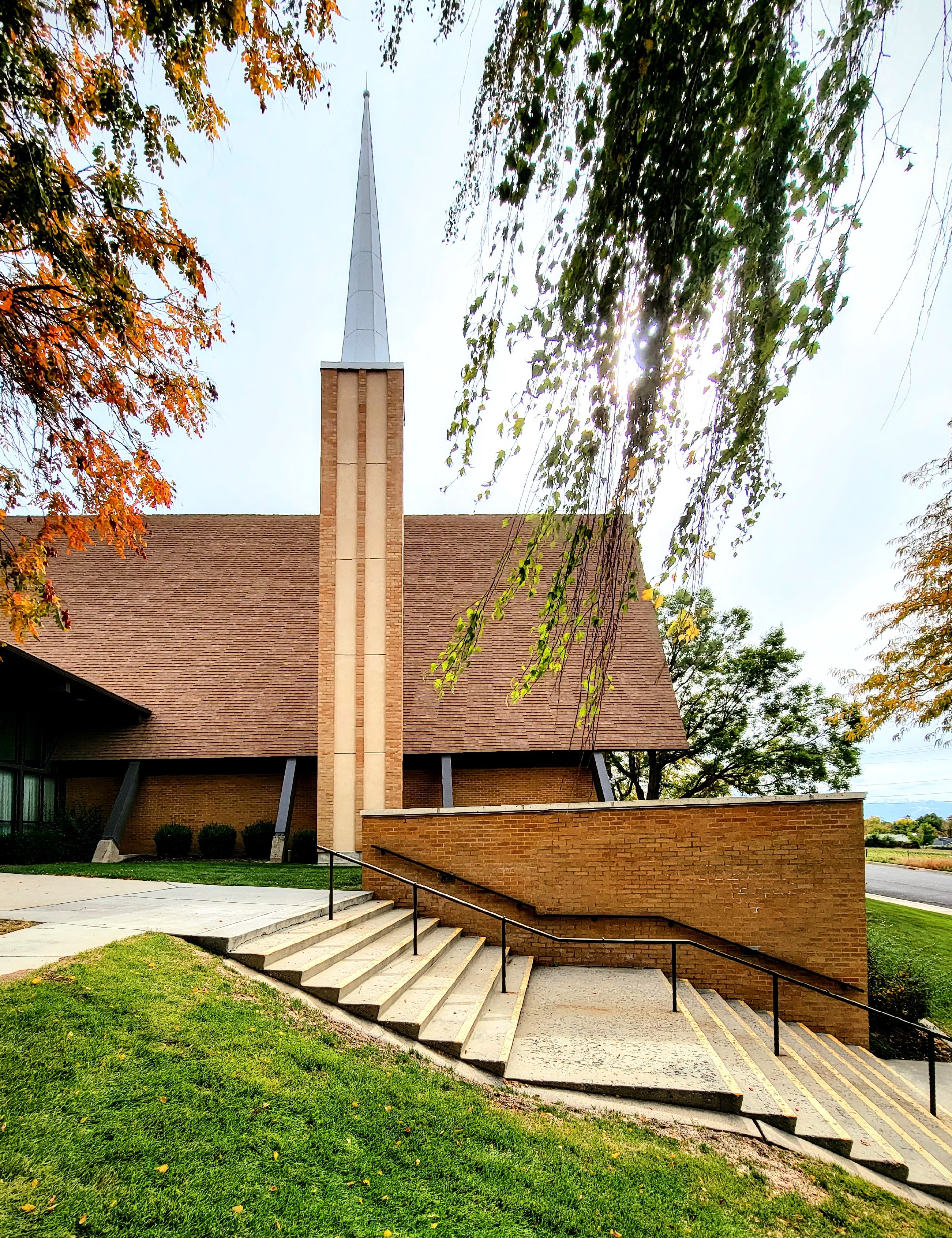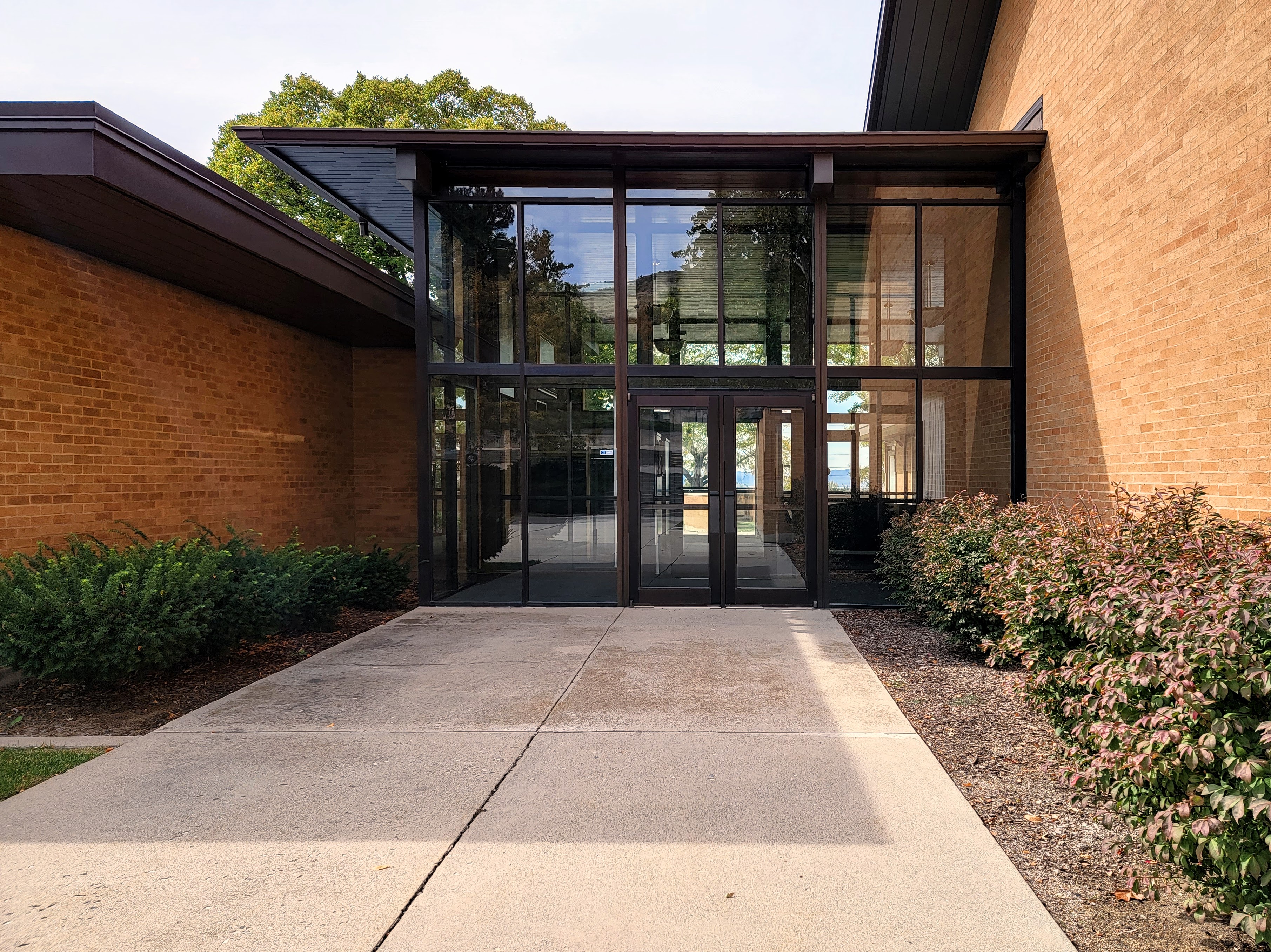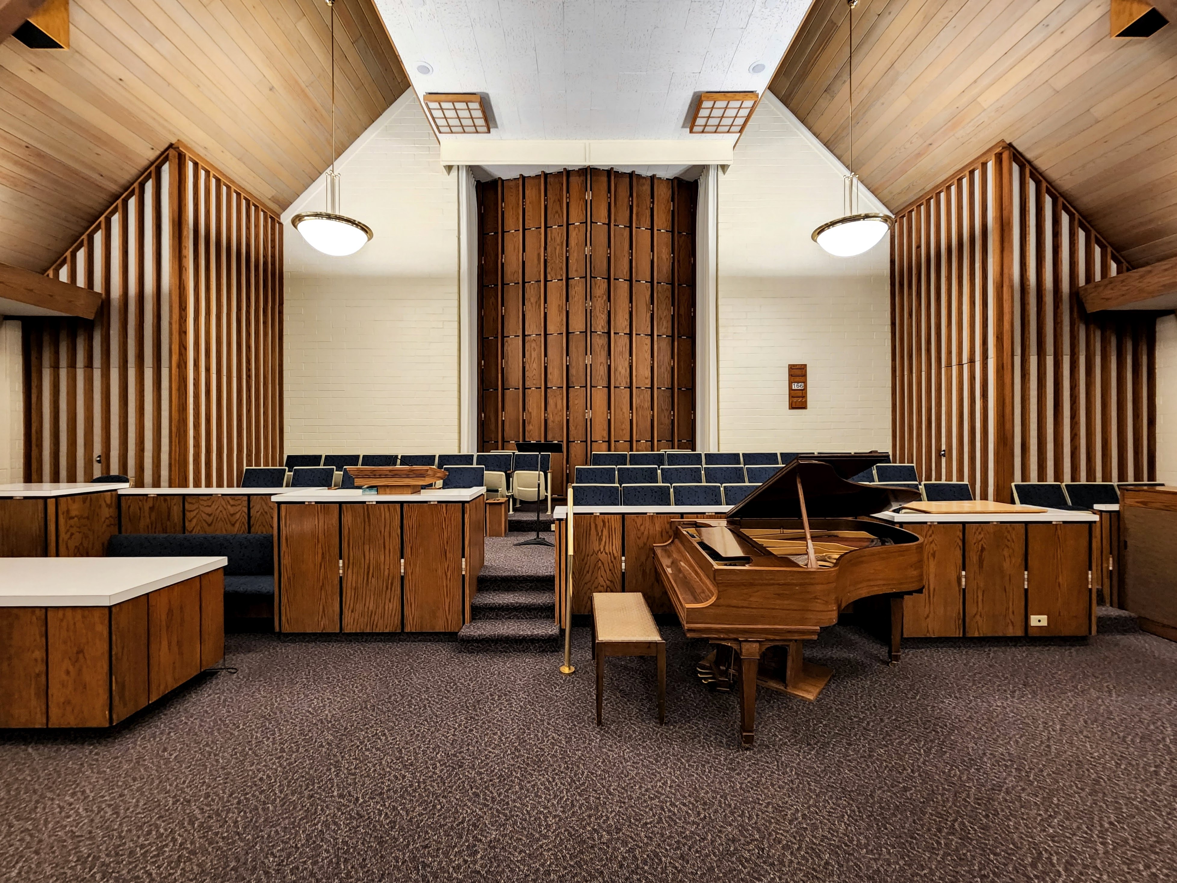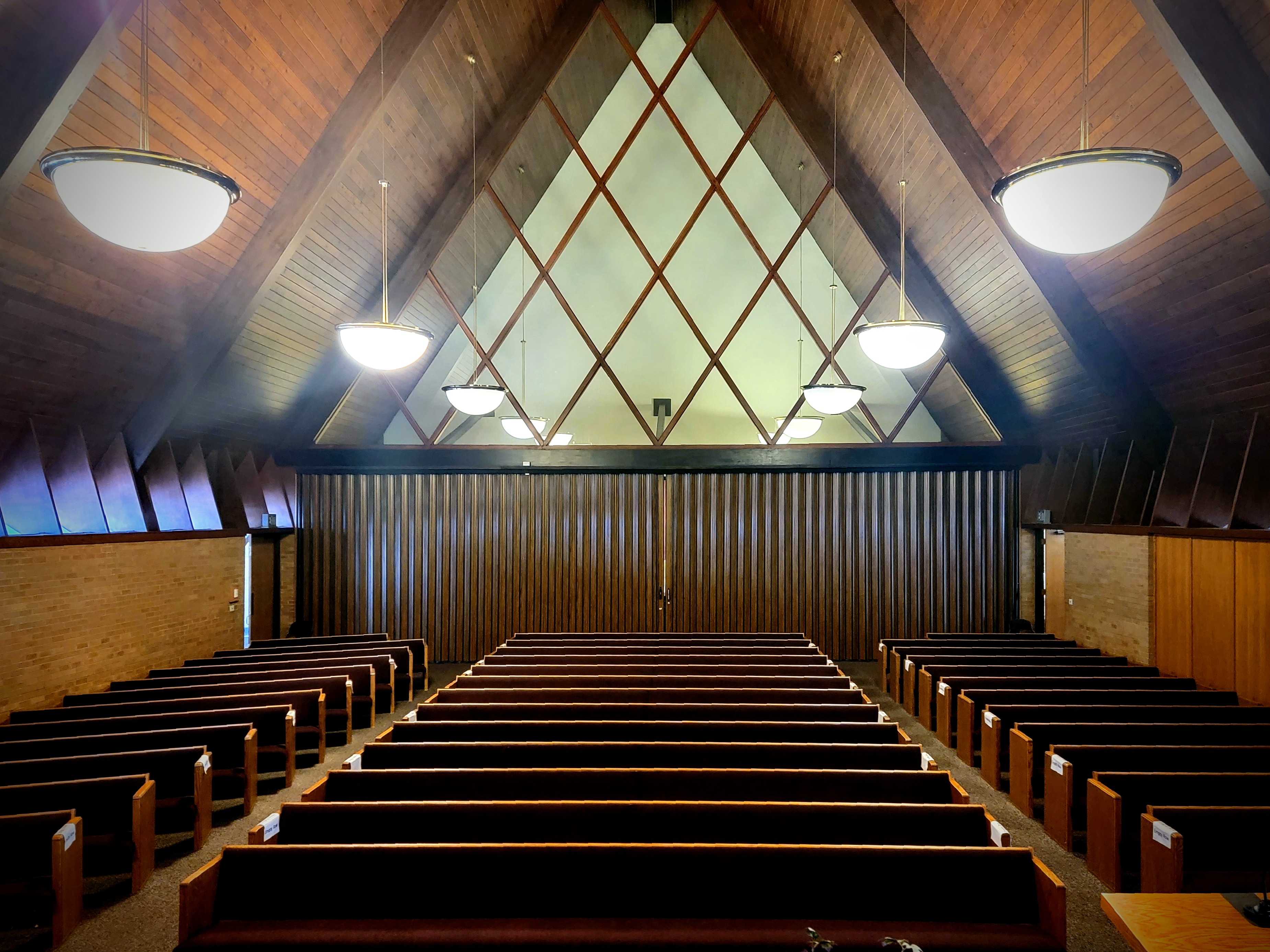 Bountiful is blessed with no less than five A-frame meetinghouses (four LDS and one Lutheran). The Bountiful 13th Ward contains an interesting array of stylistic elements. The entryway is an austere glass structure built in the International Style of Mies van der Rohe’s Seagram Building. The steeple’s pointy tower evokes Italian medievalism. The A-frame chapel is covered in dark wood paneling which gives it a warm, enclosed feel. The rostrum has what might be described as a “rude screen.” In traditional Christian architecture, the rude screen is a tall wooden frame that separates the priests celebrating the eucharist from the rest of the congregation. This unique design contributes a sense of mystery and ritualization which might seem foreign to an LDS service, but which nevertheless imbues the space with reverence.