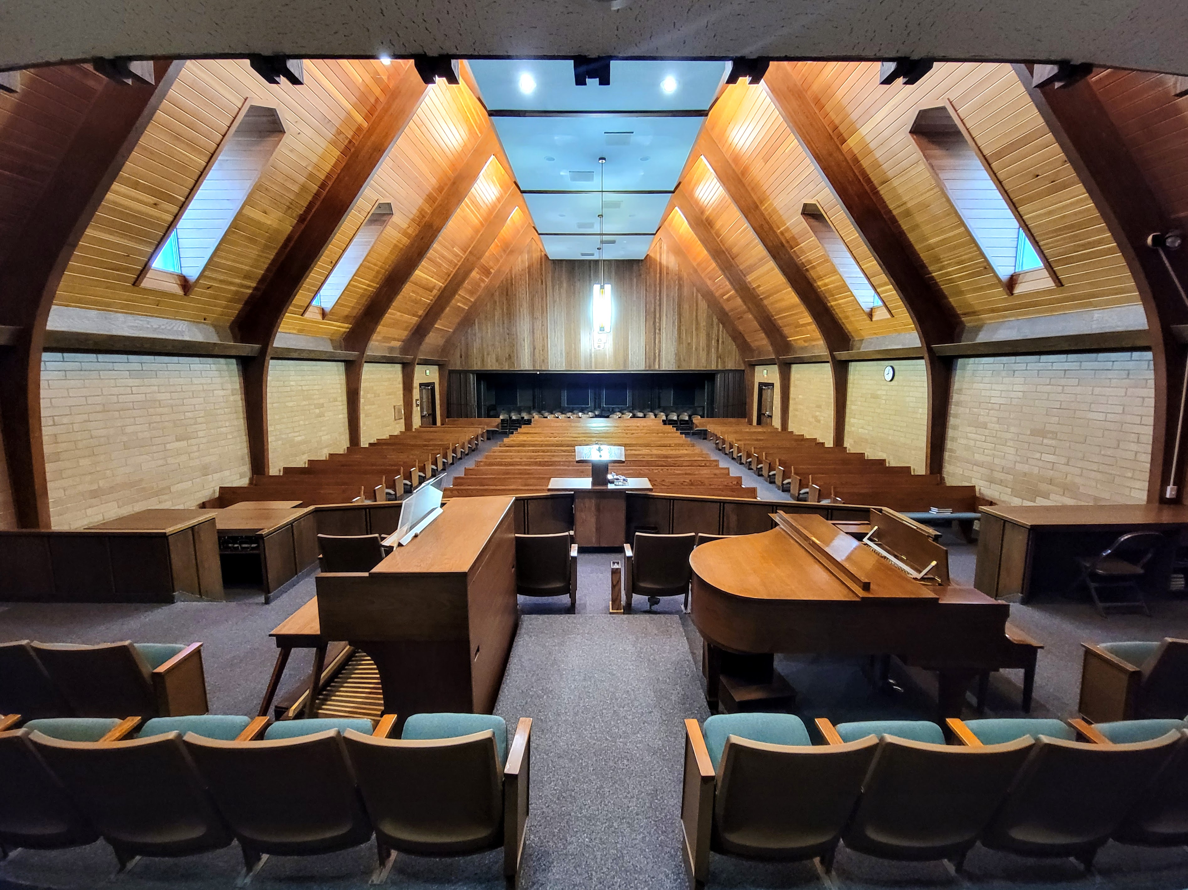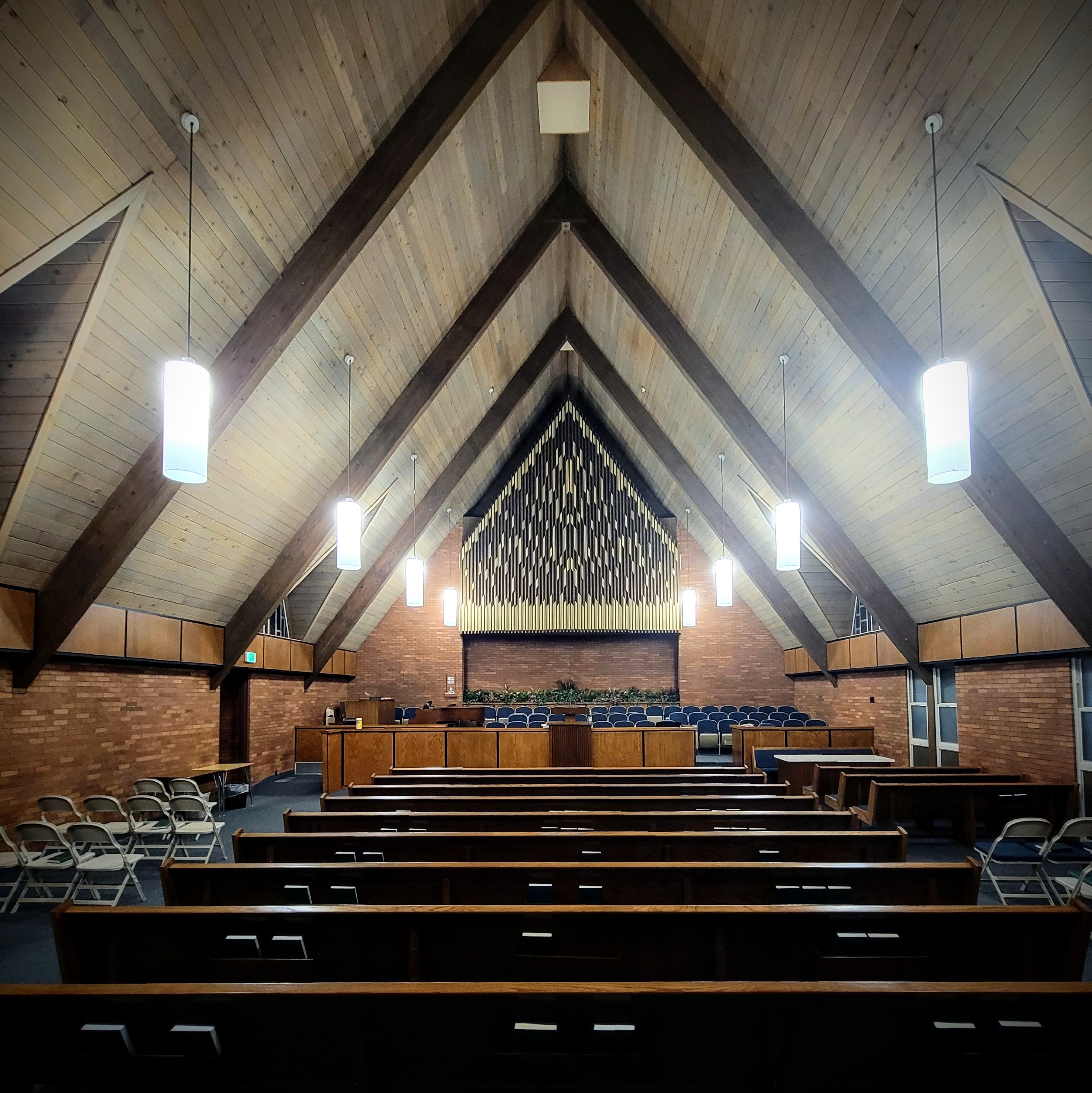 In the 50s and 60s, LDS architects started applying Frank Lloyd Wright’s principles of ornamentation. It is rare to find an LDS meetinghouse in the 60s that doesn’t have at least some ornamentation, often a subtly designed pattern in the outer brickwork. These designs emerge organically from the material of the building as Wright recommended, “of the thing, not on it.” They represent a clear departure from the superficial ornamentation tacked onto the earlier International Style meetinghouses. The ornamentation also distinguishes these meetinghouses from the abstract purity of the midcentury modern styles that inspired their overall structure. Sophisticated use of ornamentation continues on the inside, where vertical shafts of gold decorate organ lofts and segments of wood are arranged into designs that seamlessly emerge from the overall construction.