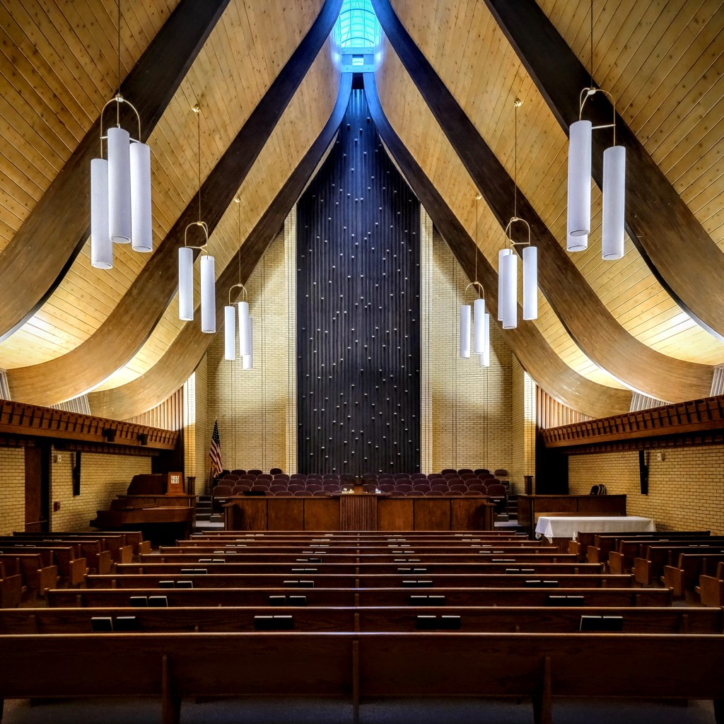 It can be difficult to design a church in a modernist style that still “looks like a church.” Traditional motifs in gothic or classical styles can convey spiritual feelings because of their historical association with religious architecture. The A-frame church is an obvious solution to this problem. Its simple, triangular shape evokes a wide array of religious sentiments. In her analysis of post-war Christian architecture, Gretchen Buggeln notes that the A-frame church was often perceived as ” praying hands, a triangle representing the Trinity, a tent for God’s people on the move, an inverted ark, or even a cave for quiet renewal.”