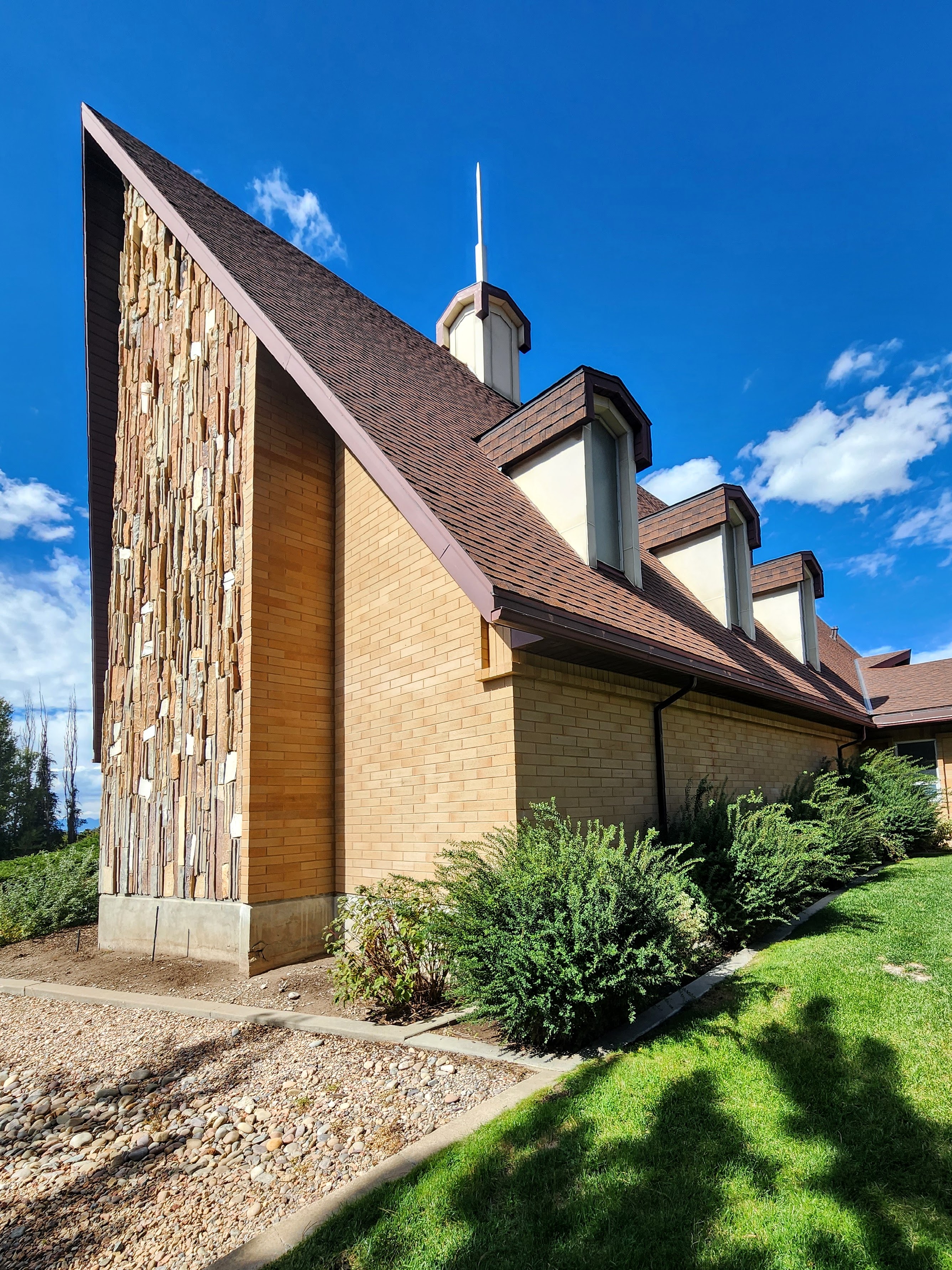 The Mueller Park 1st Ward has one of the tallest facades of any LDS meetinghouse. The roof is set at an exceptionally steep grade, its height augmented by the setting at the top of a hill overlooking the valley. A narrow column of stone decorates the facade which gleams like gold in the afternoon sun. Its steeple looks like an enormous piece of factory machinery, an odd choice, but an interesting one. The interior is rather plain, but its sheer verticality still has a transcendent effect.