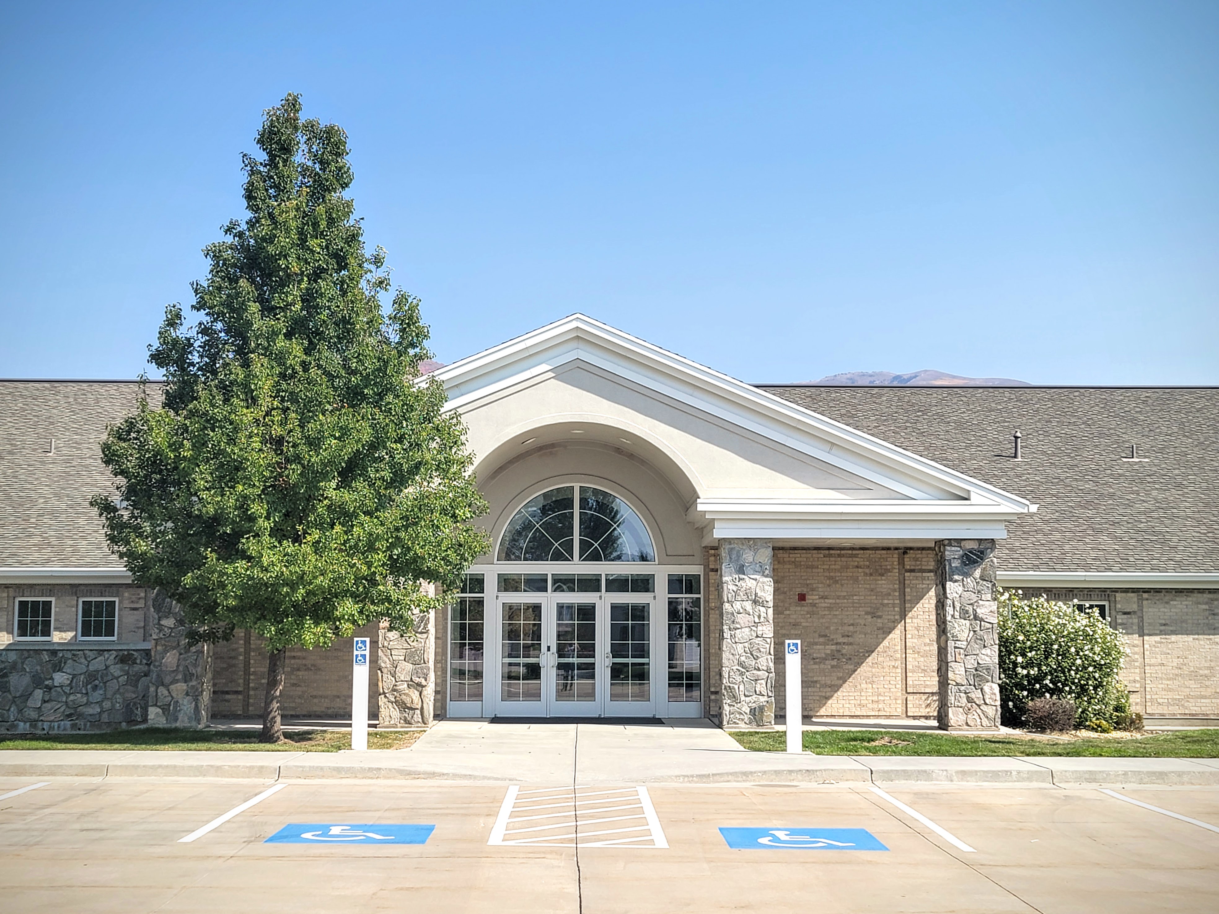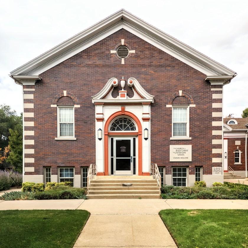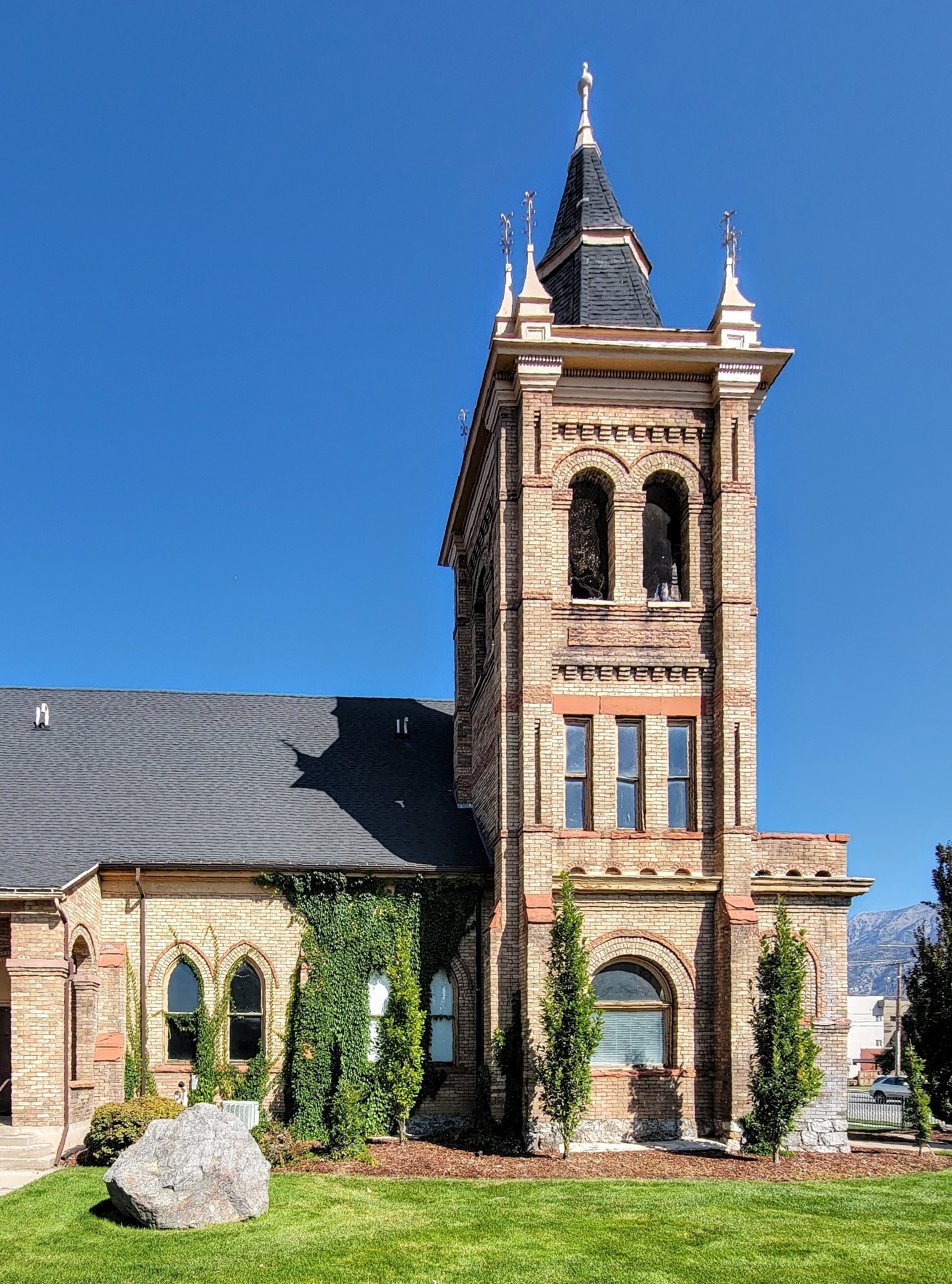 The 3rd Ward Chapel is dominated by an enormous tower, still impressive today as it stands near Provo’s business district with its multistory office buildings. The tower is decorated with eight large polychromatic brick arches topped by a gothic steeple. It also includes a romanesque portico to the side of the building and a mixture of gothic and arched windows around the ground floor. The chapel was built in 1903 by Richard Watkins, who also designed the Spring City Tabernacle, another romanesque structure. The building was sold in 1976 and today is the home of the Discovery Academy. The building has been so thoroughly remodeled and added to over the years that it is difficult to get a sense of its original interior.