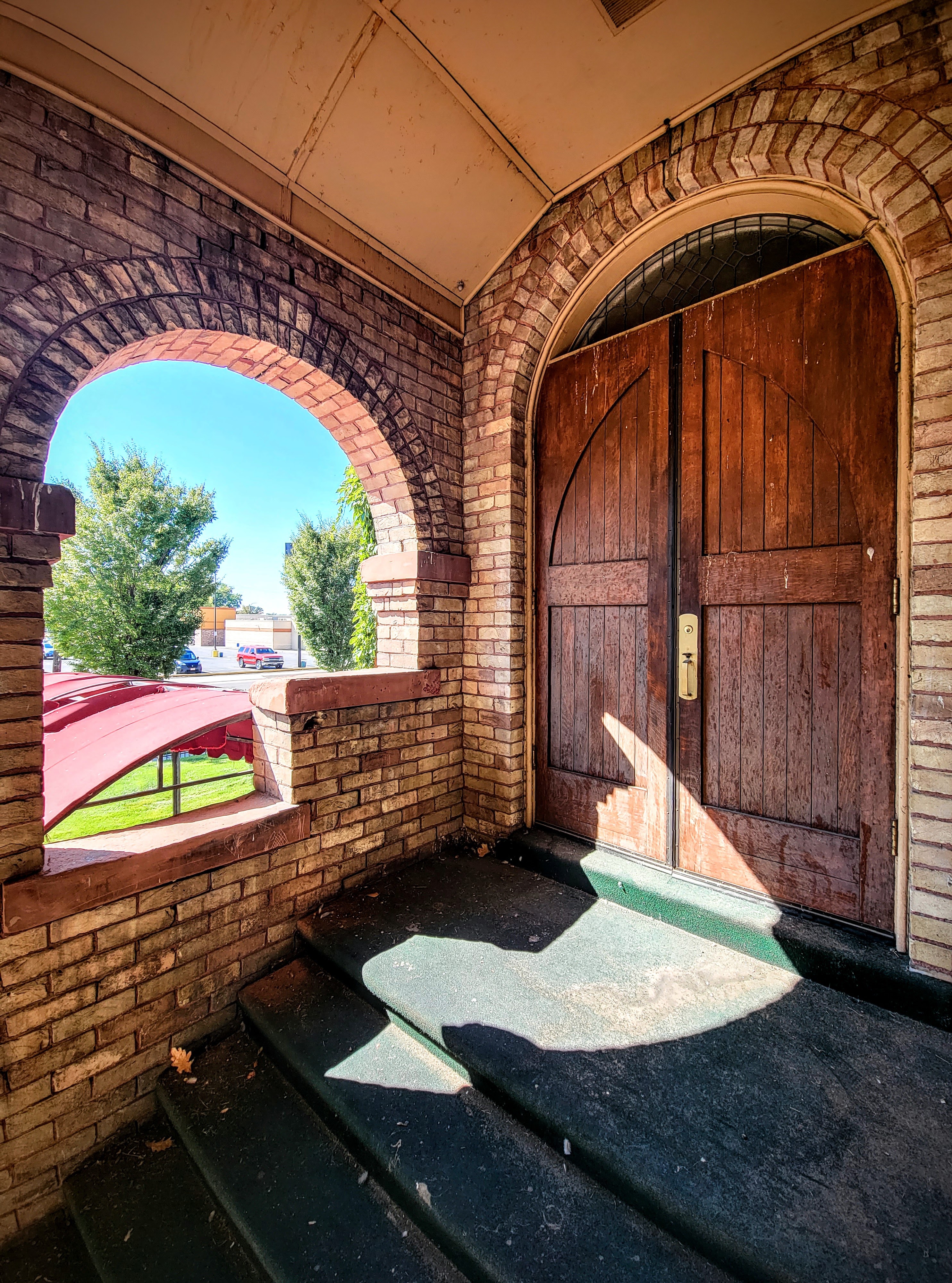 German schmear is a faux-antique brick look that I’ve noticed in some new LDS meetinghouses. It seems to be less about trying to look old as it is trying to add vibrancy to the brickwork. It has a particularly energetic appearance here in the backdoor to the meetinghouse.