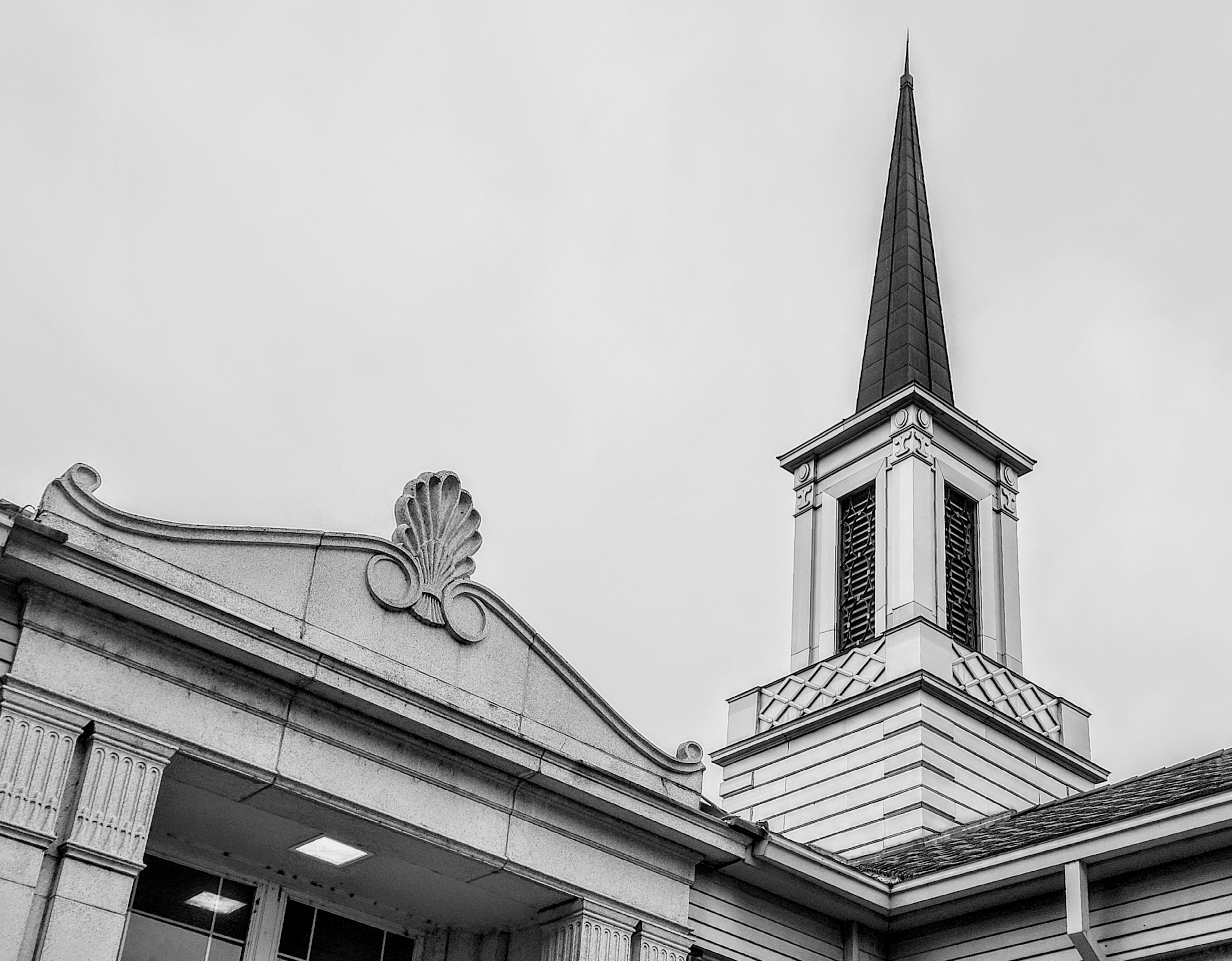 Traditionalists in the church ended up compromising with the modernists. Most of the churches built in the 40s and 50s are modern in their overall form and construction materials. But they were often decorated with simplified traditional motifs, either classical, oriental, or eclectic. There is something unsatisfactory about this compromise. As traditional architecture, these churches often fail to “look like churches.” Apart from the steeples, the silhouettes of the meetinghouses have more in common with schools or hospitals. And as modern architecture, the traditional motifs sometimes make the structures look too stylized. However these meetinghouses dutifully served a generation of church members and are dearly beloved by those who grew up with them. As can be seen from the gallery below, they still have a certain vintage charm about them.