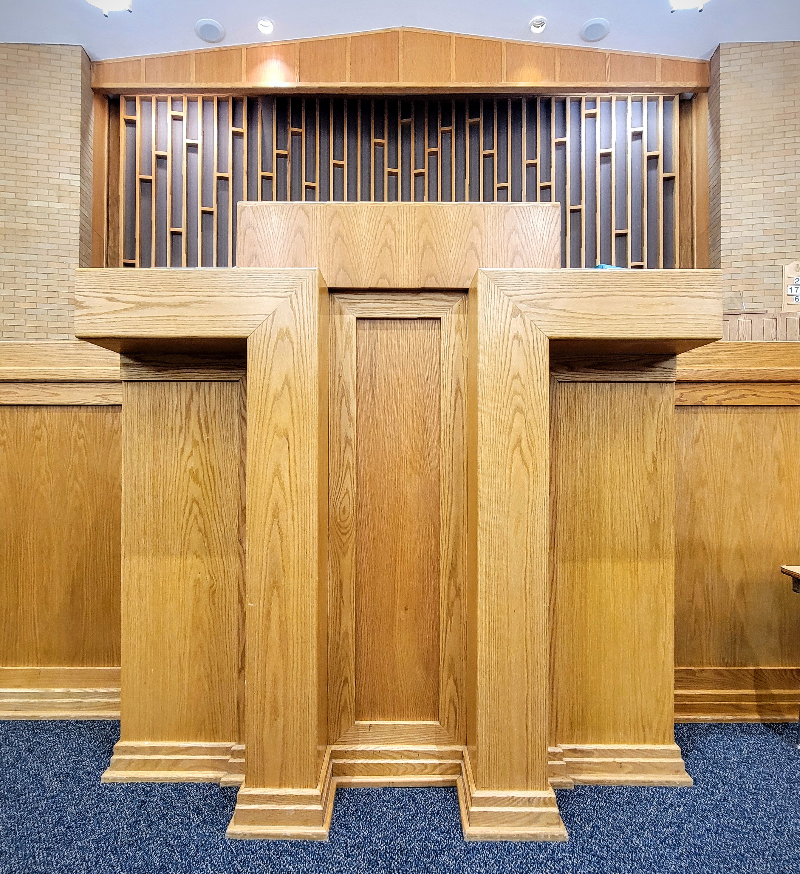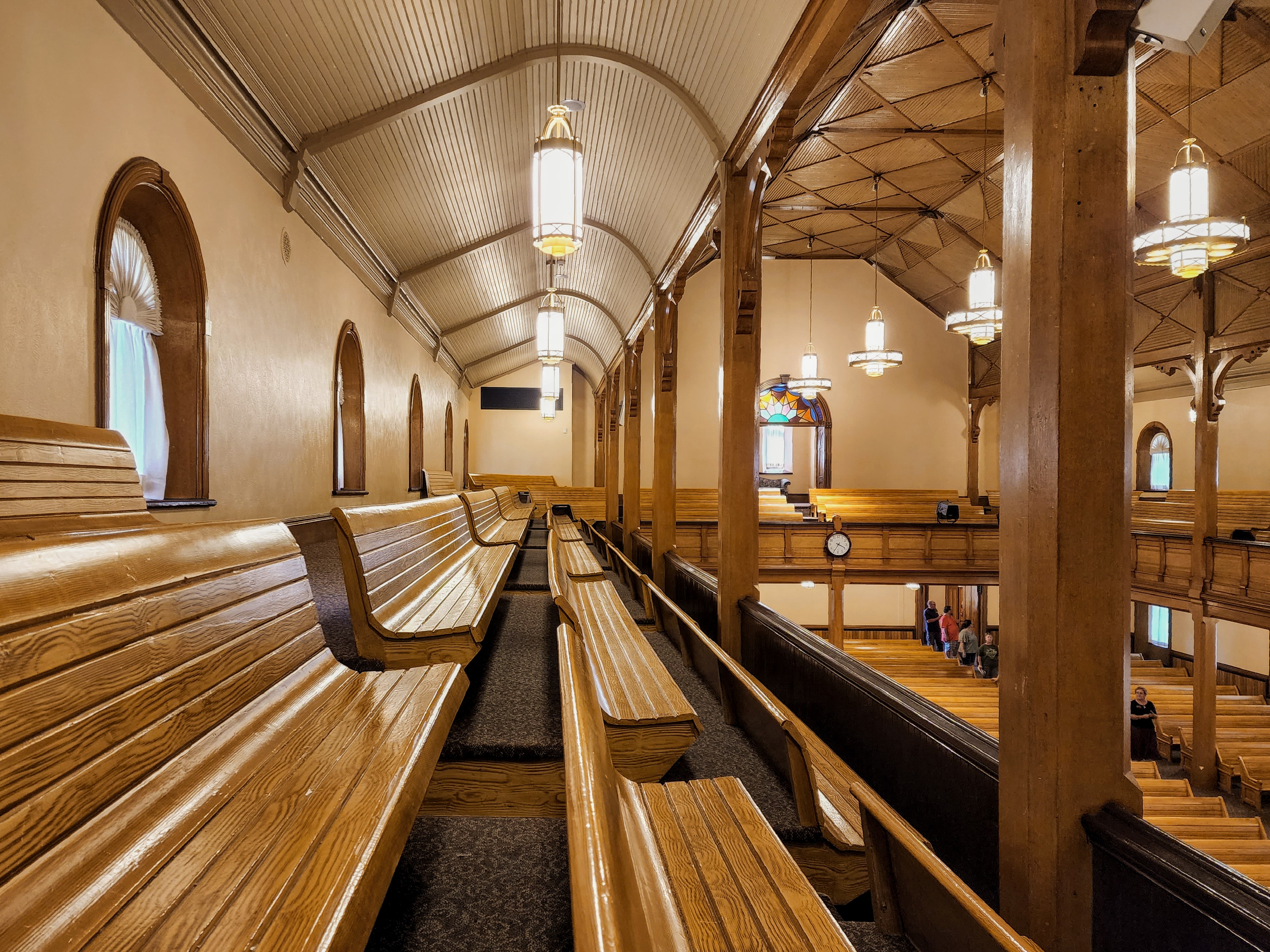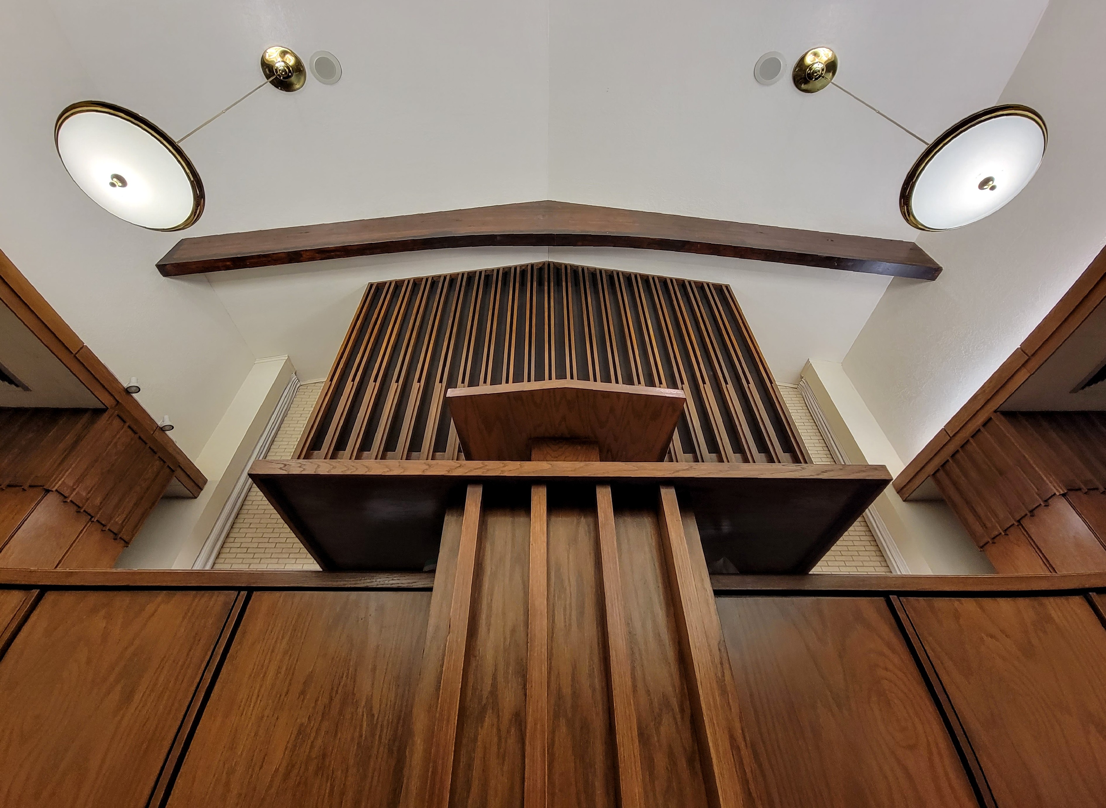 This Springville chapel contains a unique, sculpted ceiling and an organ housed within a pyramid-like frame. Art Deco theater ceilings sometimes featured sculptural wave motifs, like the famous one at Radio City Music Hall, where a series of rounded arches surround the stage, evoking the idea of sound waves. In the Springville chapel’s ceiling, the waves span out horizontally across the length of the chapel.