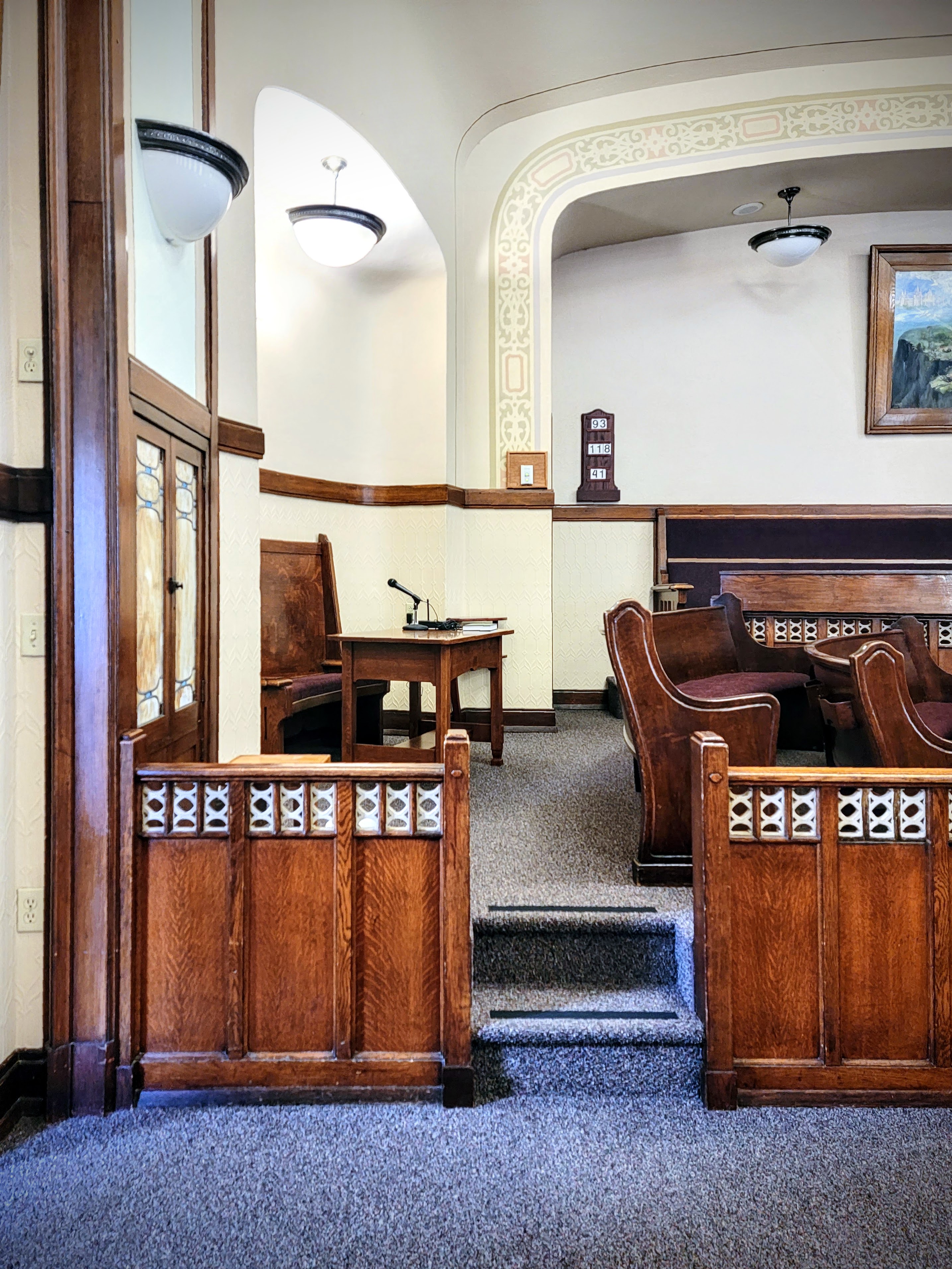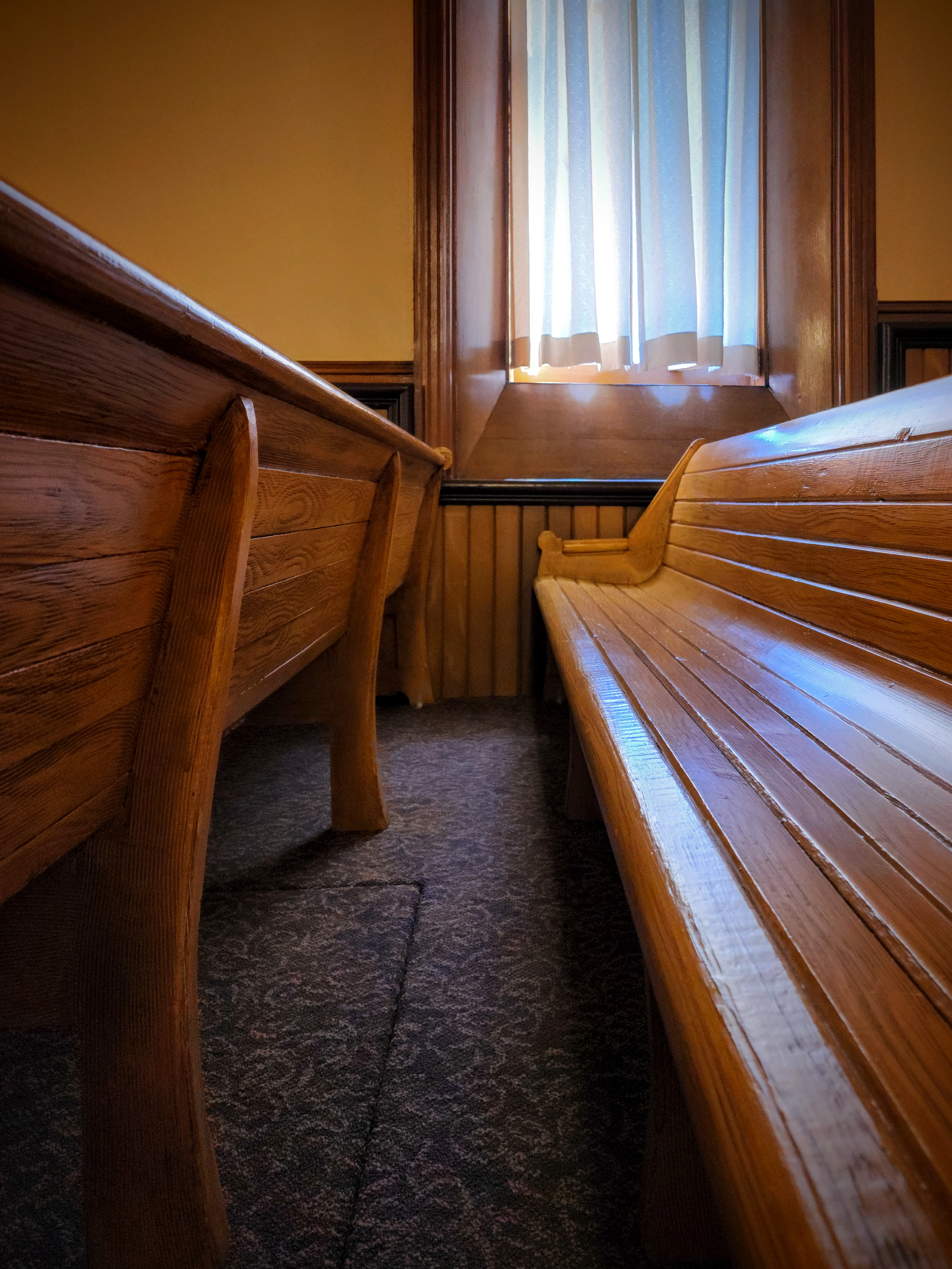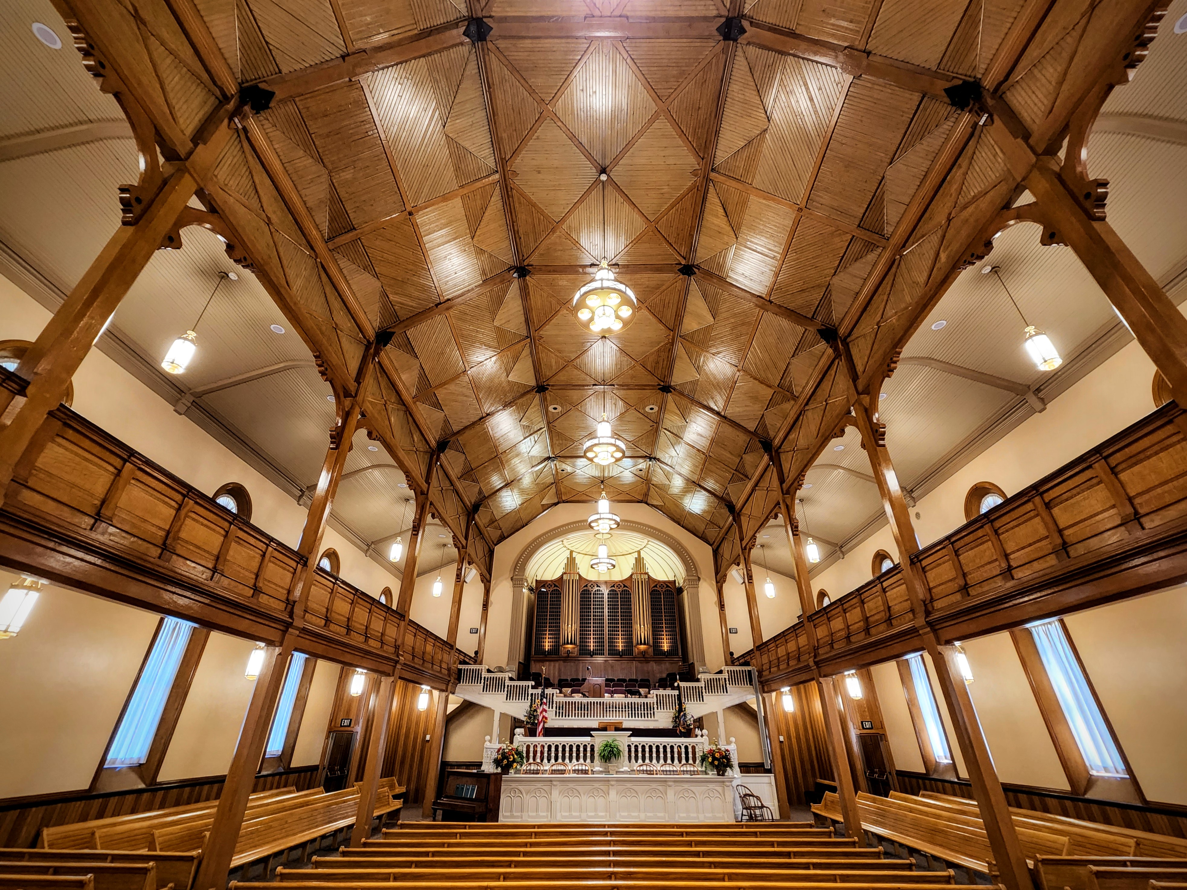 This Springville chapel contains a unique, sculpted ceiling and an organ housed within a pyramid-like frame. Art Deco theater ceilings sometimes featured sculptural wave motifs, like the famous one at Radio City Music Hall, where a series of rounded arches surround the stage, evoking the idea of sound waves. In the Springville chapel’s ceiling, the waves span out horizontally across the length of the chapel.
