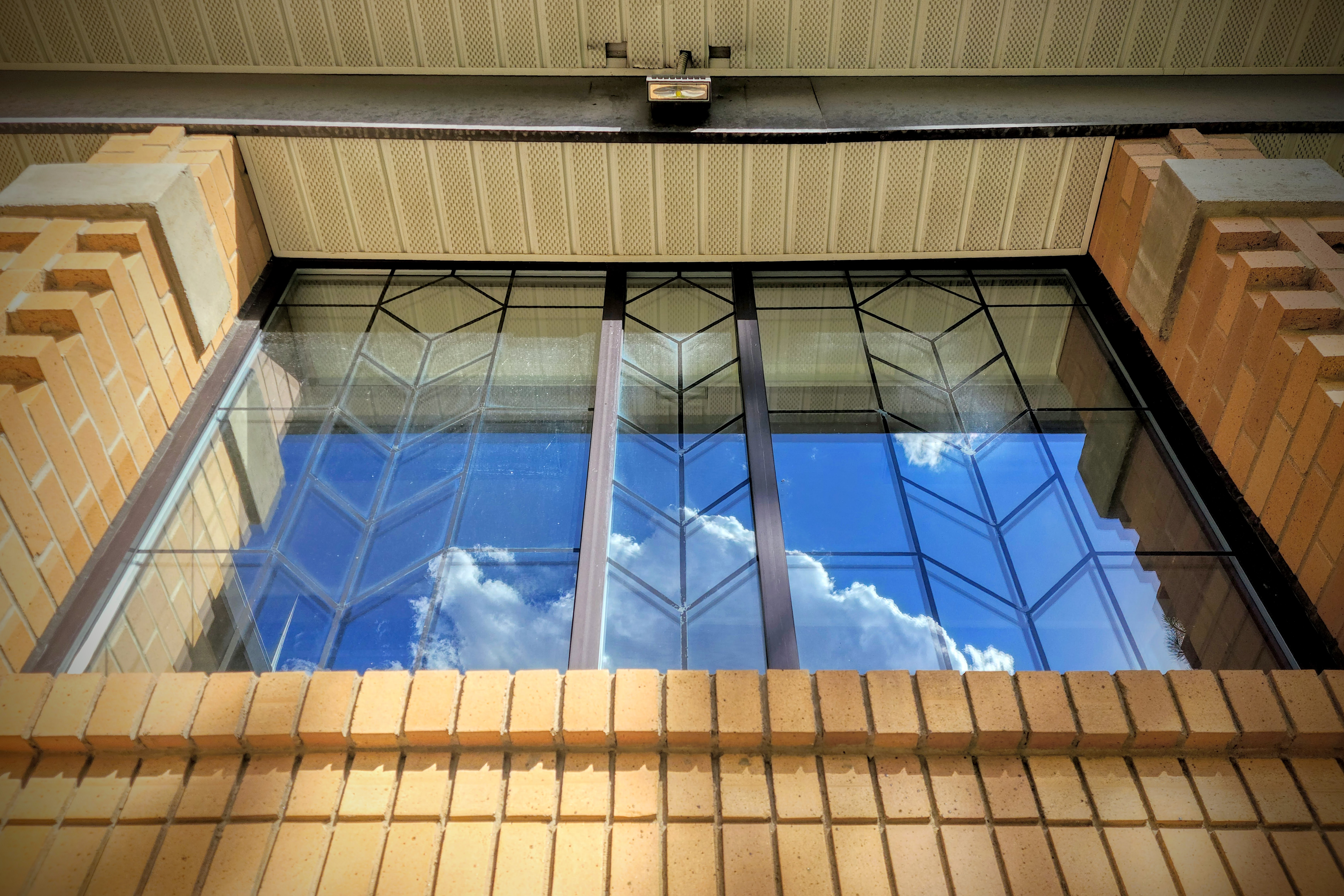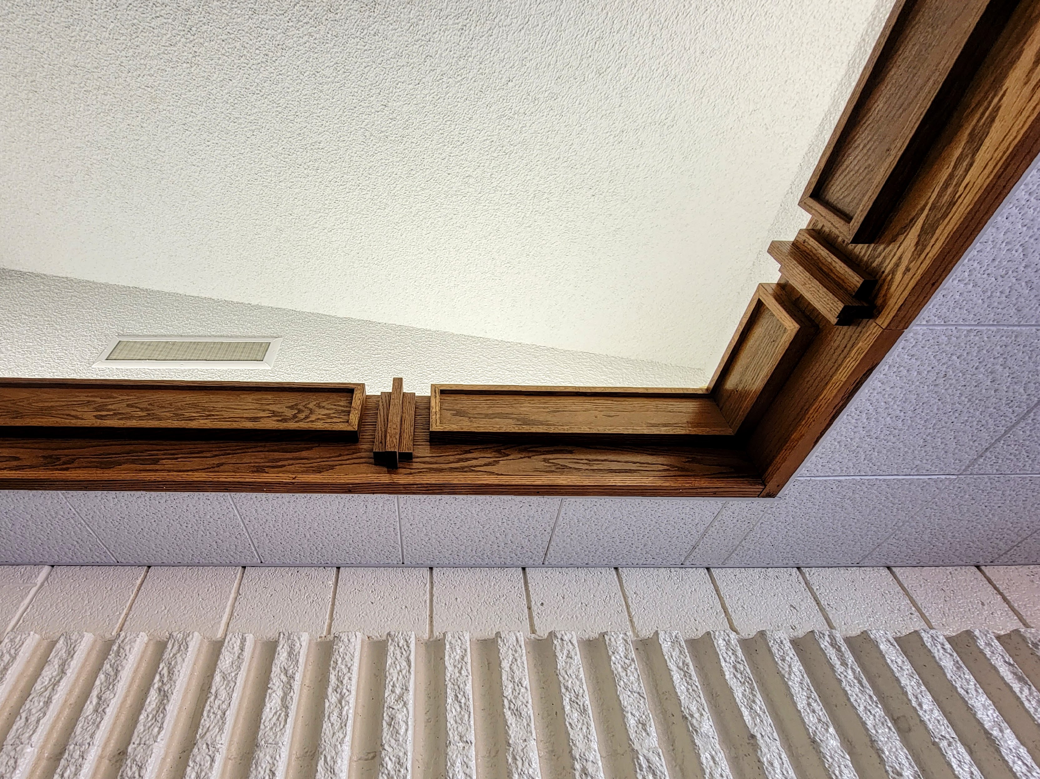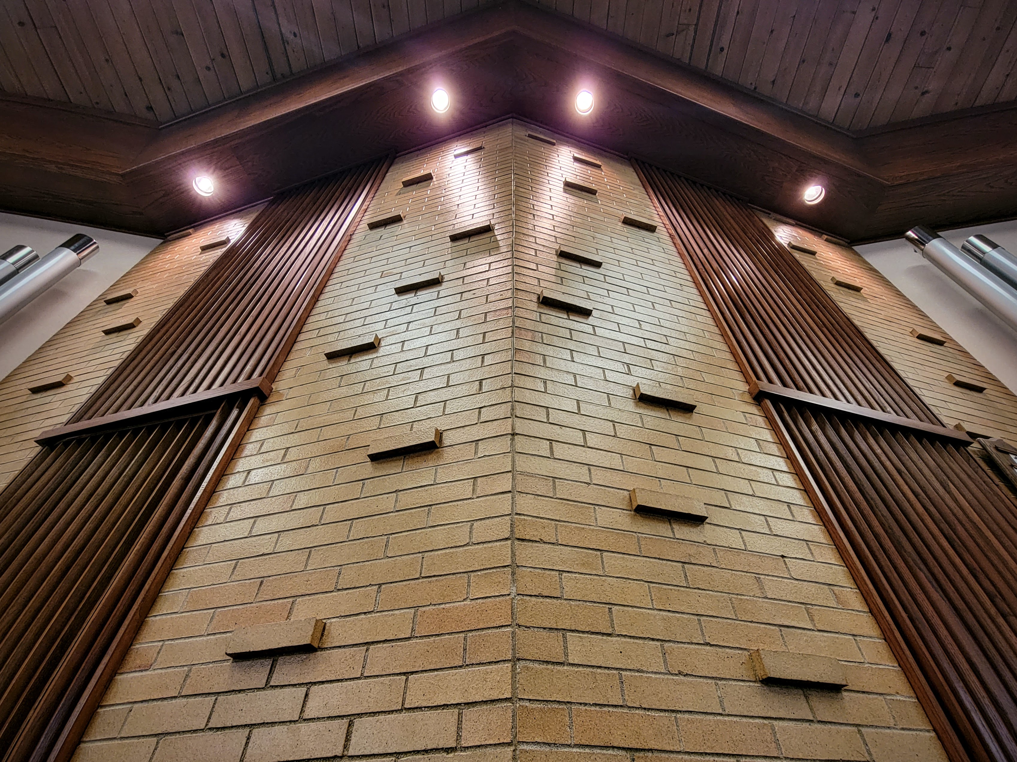 In the 50s and 60s, LDS architects started applying Frank Lloyd Wright’s principles of ornamentation. It is rare to find an LDS meetinghouse in the 60s that doesn’t have at least some ornamentation, often a subtly designed pattern in the outer brickwork. These designs emerge organically from the material of the building as Wright recommended, “of the thing, not on it.” They represent a clear departure from the superficial ornamentation tacked onto the earlier International Style meetinghouses. The ornamentation also distinguishes these meetinghouses from the abstract purity of the midcentury modern styles that inspired their overall structure. Sophisticated use of ornamentation continues on the inside, where vertical shafts of gold decorate organ lofts and segments of wood are arranged into designs that seamlessly emerge from the overall construction.