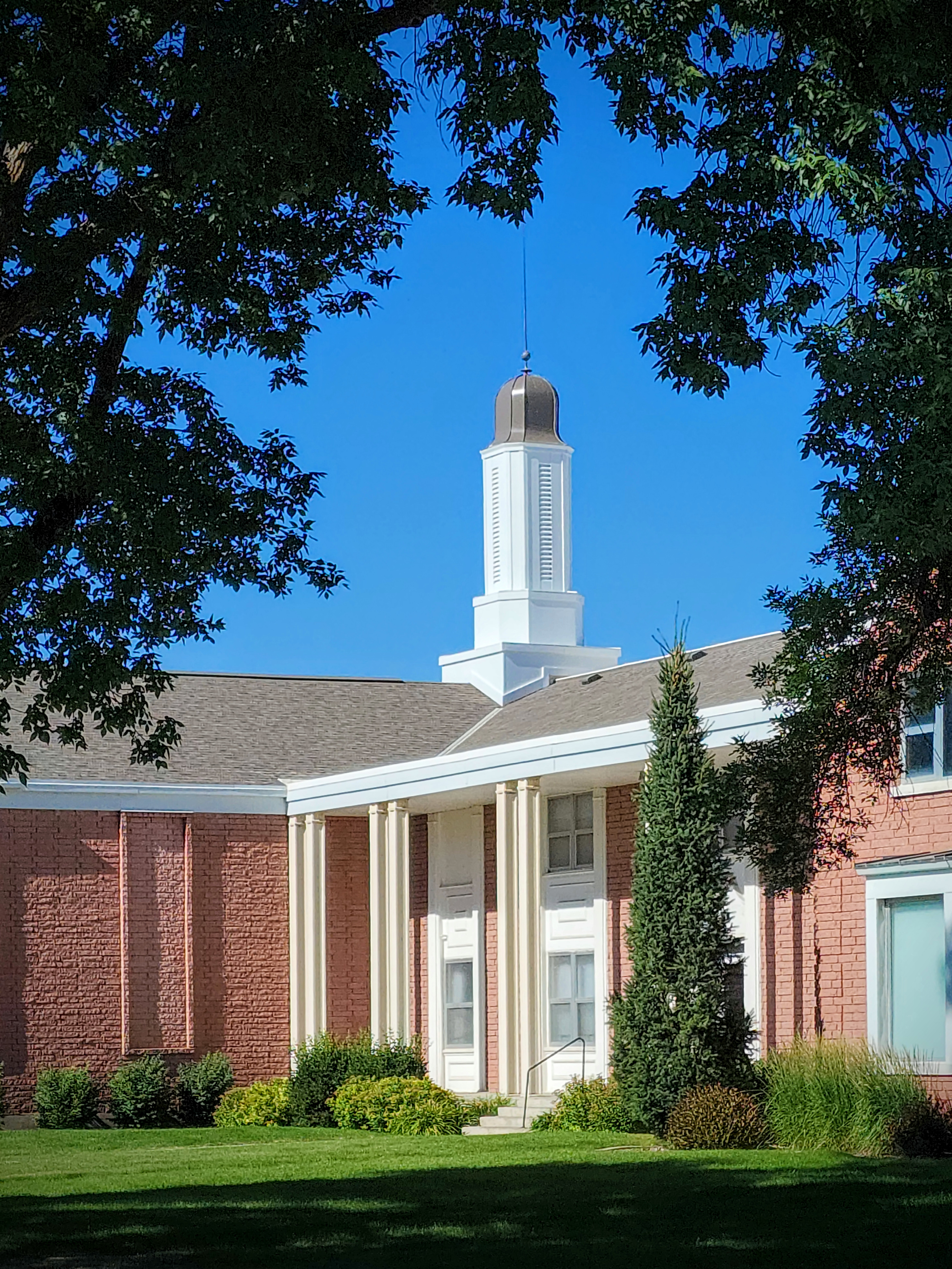 The Prairie style is an American form of architecture pioneered by Frank Lloyd Wright. In the early 20th century, many LDS architects came under the spell of Mr. Wright’s genius. Nearly one hundred LDS buildings were designed in the Prairie style, including a few temples. The defining feature of the Prairie style is its emphasis on horizontal rather than vertical lines. This poses obvious problems from the point of view of church architecture. Typically churches are designed to orient the worshiper vertically, toward the heavens. Hence the traditional use of steeples, pointed gothic windows, lofty ceilings, etc. How does one accomplish this within the confines of the Prairie style, which, in the words of Frank Lloyd Wright, should be “married to the ground?”
